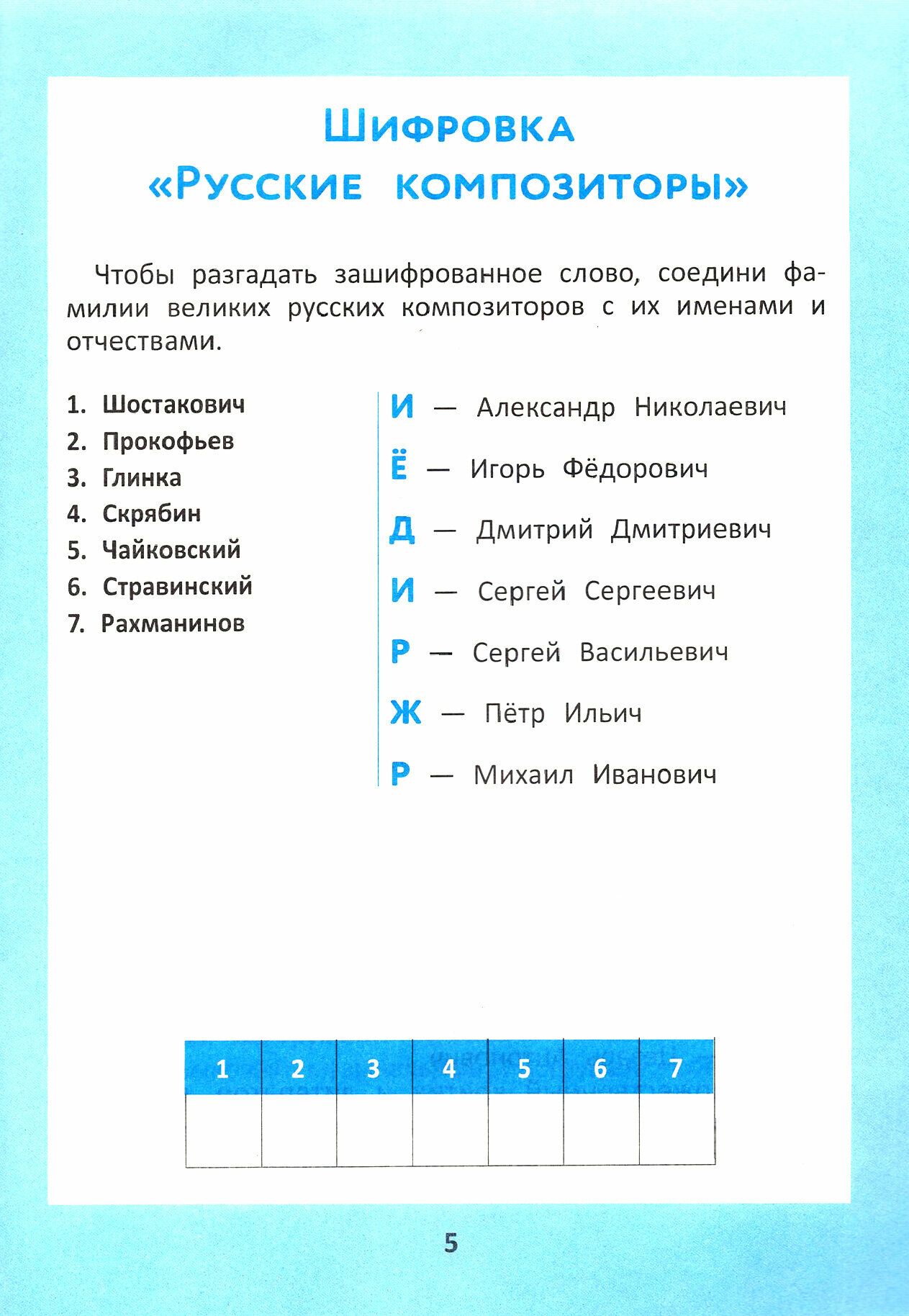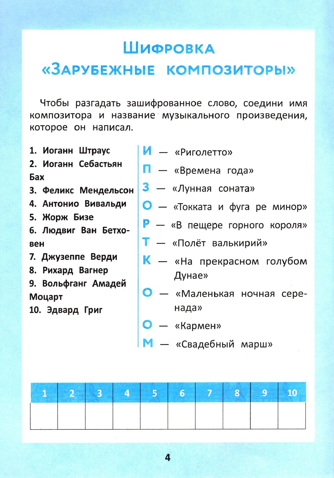 Увлекательные игровые задания, связанные с музыкальным искусством, в значительной степени могут разнообразить учебный процесс в школе, заинтересовать детей музыкой, а также способствовать умственному развитию младших школьников. Разнообразные виды кроссвордов, головоломок, музыкальных ребусов и шифровок, включенные в данный сборник, помогут ученикам начальных классов успешно освоить отдельные темы программы по музыке, выучить имена русских и зарубежных композиторов, запомнить названия видов и жанров музыкальных произведений, а также наименования инструментов и специальных музыкальных символов.