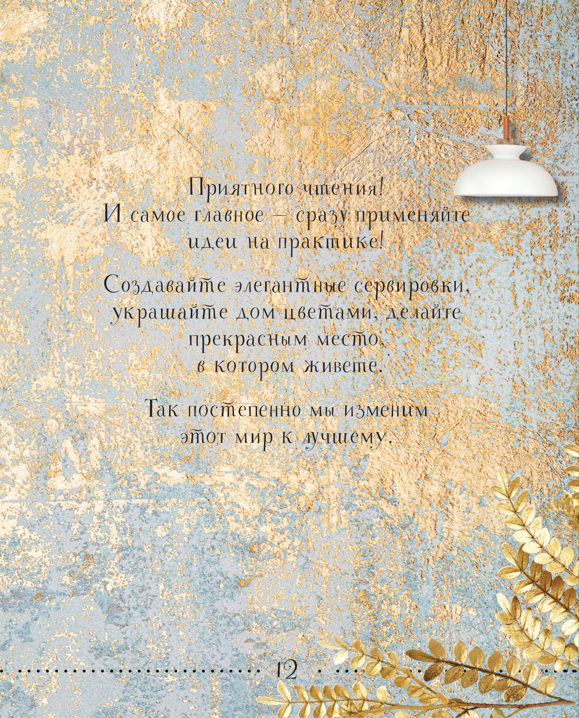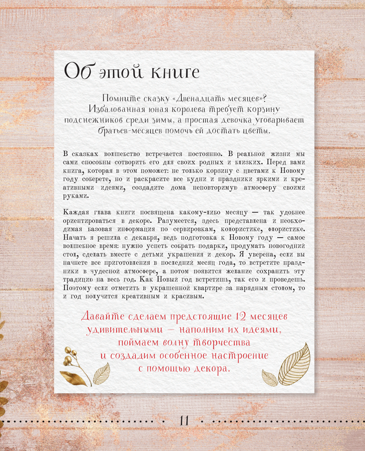 Для всех, кто хочет превратить свой дом в особое место, создать необыкновенную атмосферу уюта и комфорта, где все будет сделано для вас и ваших близких, эта книга станет поводом к первому шагу в качестве настоящего творца. Она вдохновит вас на создание своей семейной копилки традиций и воспоминаний: красиво накрытый стол, букет цветов на праздник, гармонично подобранный текстиль.