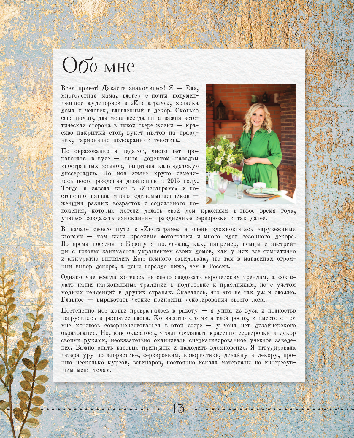 Автор этой книги - Instagram-блогер @julia.fir, многодетная мама, человек, влюбленный в цветы, декор и сервировки. Несколько лет назад оставила успешную академическую карьеру ради ведения блога, в котором делится идеями сезонного декора и лайфхаками по организации домашнего хозяйства. Сезонный декор - это часть семейных традиций, подготовка к празднику, повод побыть с семьей: вместе изготовить пасхальное дерево, нарядить елку, покрасить яйца, сделать декоративные подсвечники из тыковок…