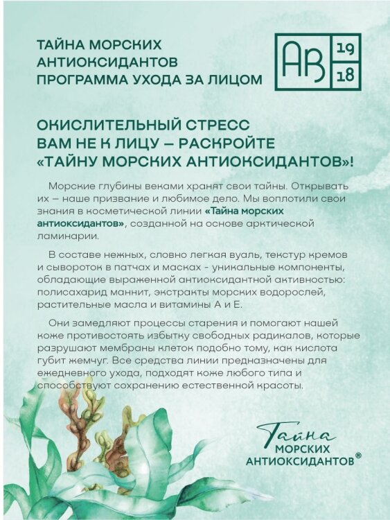 Уникальный омолаживающий дневной лифтинг-крем с морскими антиоксидантами для лица, шеи и зоны декольте на основе беломорских водорослей. Крем обладает легкой текстурой и приятным ароматом, быстро впитывается, не оставляя на лице жирного блеска. Идеально подходит в качестве основы под макияж. Активные компоненты крема из бурых морских водорослей (маннит и медные производные хлорофилла) глубоко увлажняют кожу, восстанавливают и защищают ее; оказывают антиоксидантное действие (замедляют процессы старения в коже). Экстракт сладкого миндаля Polylift обладает выраженным лифтинг-эффектом, разглаживает микрорельеф и повышает упругость кожи. Масла оливы и жожоба активно питают кожу, возвращают коже упругость и эластичность, великолепно смягчают и увлажняют её. Пантенол ускоряет заживление кожи, придает ей упругость, удерживая влагу в наружном слое эпидермиса. Применение: легкими массирующими движениями нанести крем на чистую кожу лица, шеи и декольте. Условия хранения и срок годности: Хранить в сухом, хорошо проветриваемом помещении при температуре от +5°C до +25°C. Не допускается хранение под воздействием солнечного света и вблизи отопительных приборов. Срок хранения - 18 месяцев со дня изготовления. ГОСТ Р 31460-2012