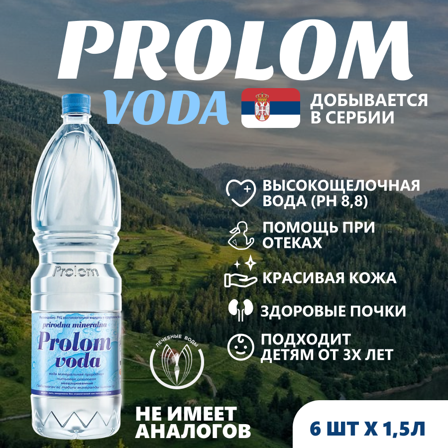 Источник Prolom расположен в горах на юге Сербии. «Пролом вода» природная негазированная столовая вода с низкой минерализацией (0,23 г/л), высокой щелочностью (pH 8,8-9,2), наличием в составе двуокиси кремния и бикарбонатов.