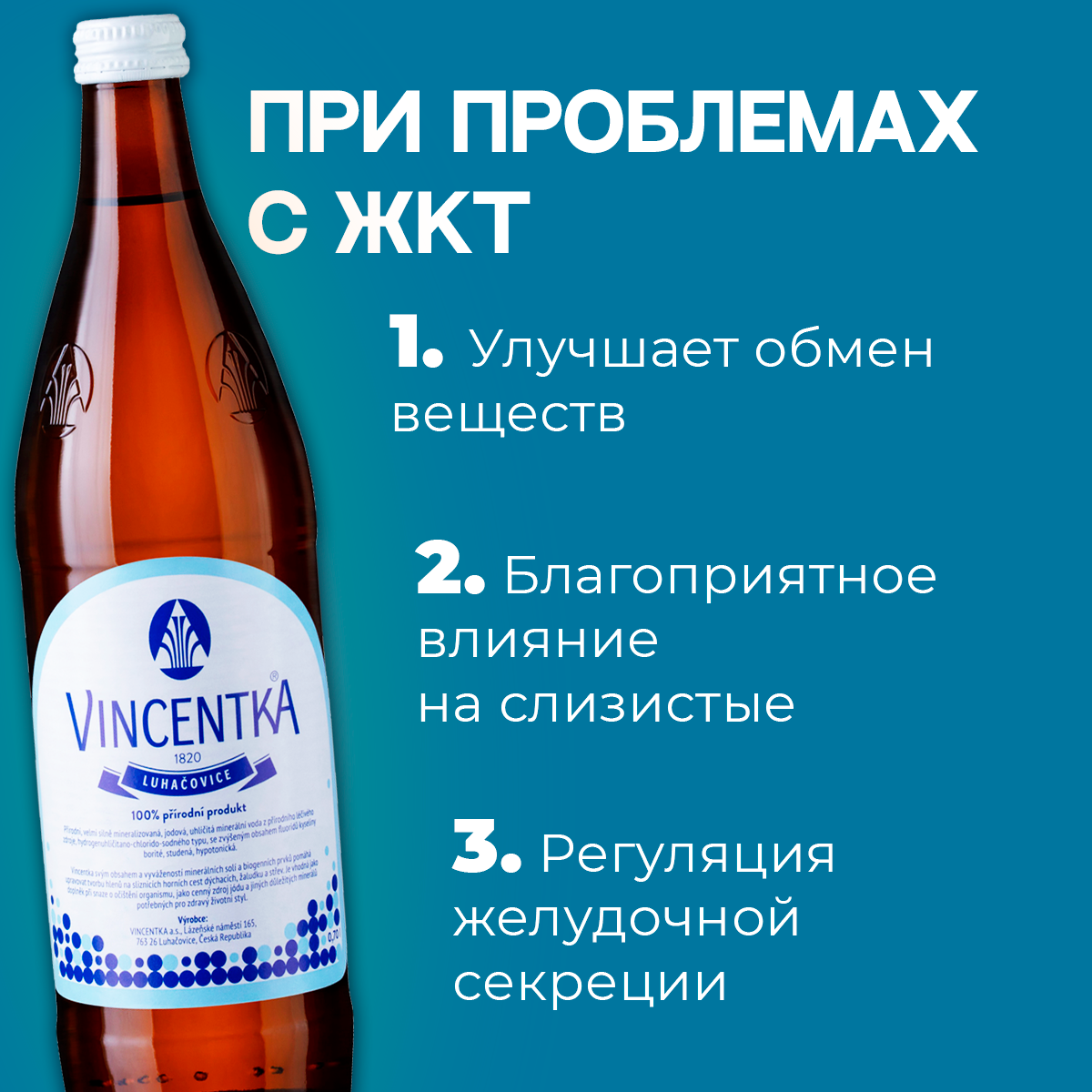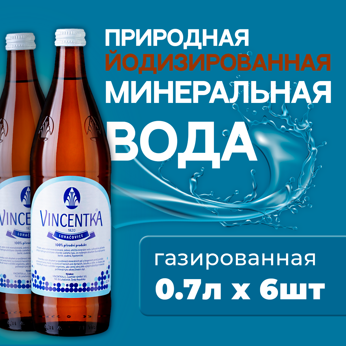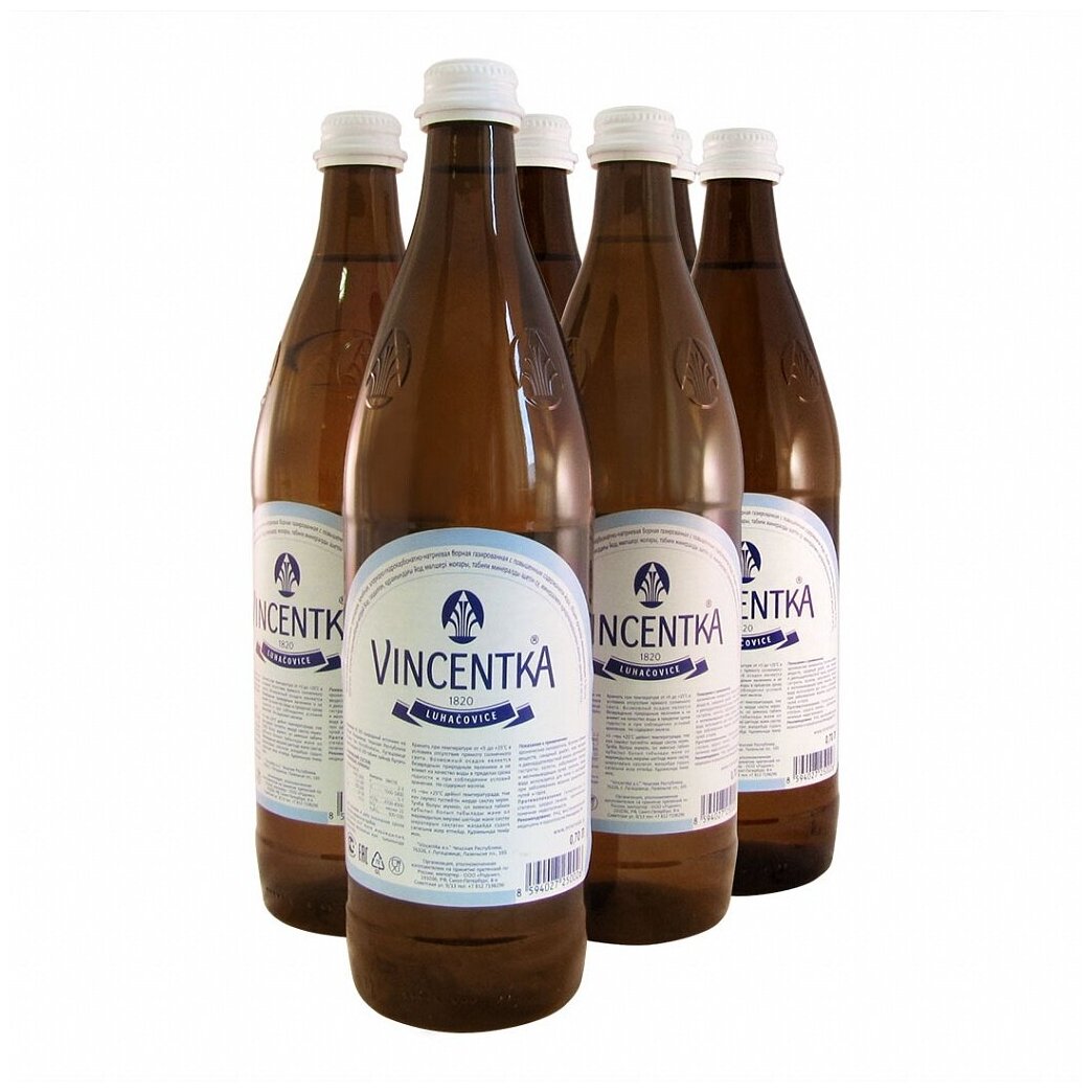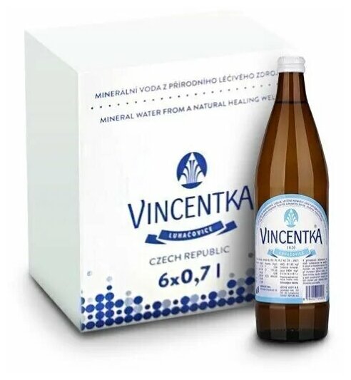 Вода древнего моря. Старейшая в мире чешская минеральная вода. Восполняет дефицит йода и усиливает действие противодиабетических лекарственных препаратов. Повышает иммунитет, является средством профилактики и помогает при температуре, ОРВИ, хронических бронхолегочных заболеваниях, ринитах и синуситах.Винсентка — минеральная вода «Винсентка» добывается и разливается в бутылки на территории Чешского курорта Лугачовице, из скважины глубиной 34,8 м. и является высоко йодированной природной лечебной среднеминерализованной щелочной водой гидрокарбонатно-хлоридно-натриевого типа с повышенным содержанием фторидов и борной кислоты, с уровнем минерализации 9,0-10,0 г./дм3По общей минерализации эта вода очень близка осмотическому давлению крови человека и внутриклеточных жидкостей. При приёме хорошо переносится и не вызывает дискомфортных ощущений в желудочно-кишечном тракте и при ингаляциях. В качестве аэрозоли не оказывает негативного воздpействия на слизистую дыхательных путей. В домашних условиях минеральную воду «Винсентка» можно использовать тремя способами: приём воды во внутрь, полоскание, ингаляции или вдыхание.Добывается продукт древнего моря на чешском курорте Лугачовице в предгорье Белых Карпат. Глубина скважины – 34,8 м. Там же она и бутилируется. Минеральный источник в виде колоннады оборудован также вблизи реки Штавнице, что протекает в центре города-курорта.