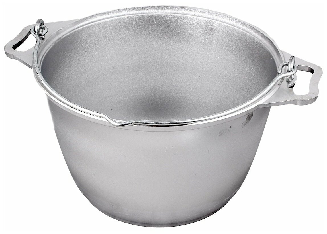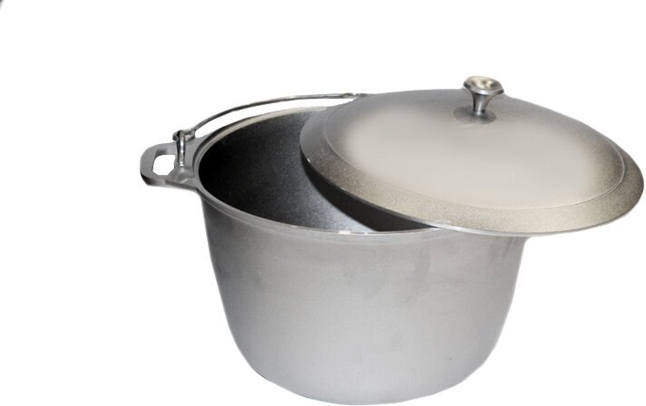 Литая алюминиевая посуда - идеальное соотношение демократичной цены, традиционного дизайна и проверенного покупателями качества. Эта посуда подходит для готовки в любых условиях, в том числе и на открытом огне. Для подвешивания над огнем имеется крепкая ручка, которая прочно крепится к котлу.