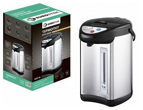 Термопот Eurostek с мощностью 800 Вт совмещает функции чайника и термоса. Он способен кипятить воду и поддерживать ее высокую температуру на заданном уровне длительное время. Объем резервуара для воды равен 5 л. Вода подается при помощи ручной помпы или электронасоса. Термопот в корпусе из металла и пластика поддерживает три режима работы: автокипячение, повторное кипячение и поддержание температуры.
