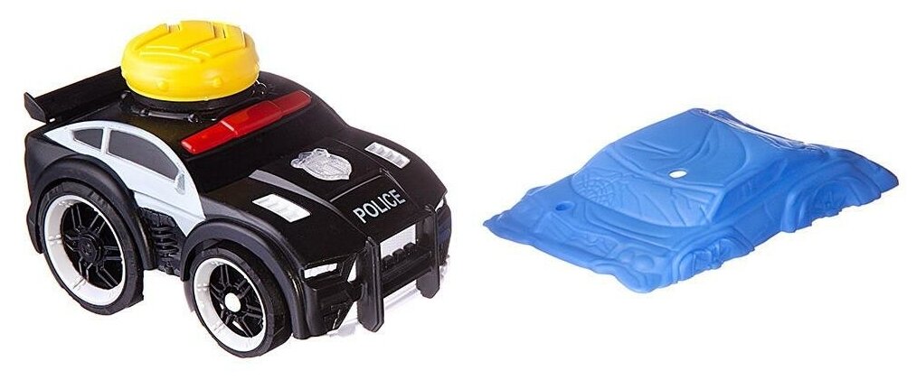 В комплекте набора: полицейская машинка (черная) и трамплинный блок-препятствие. Машинка имеет световые и звуковые эффекты.