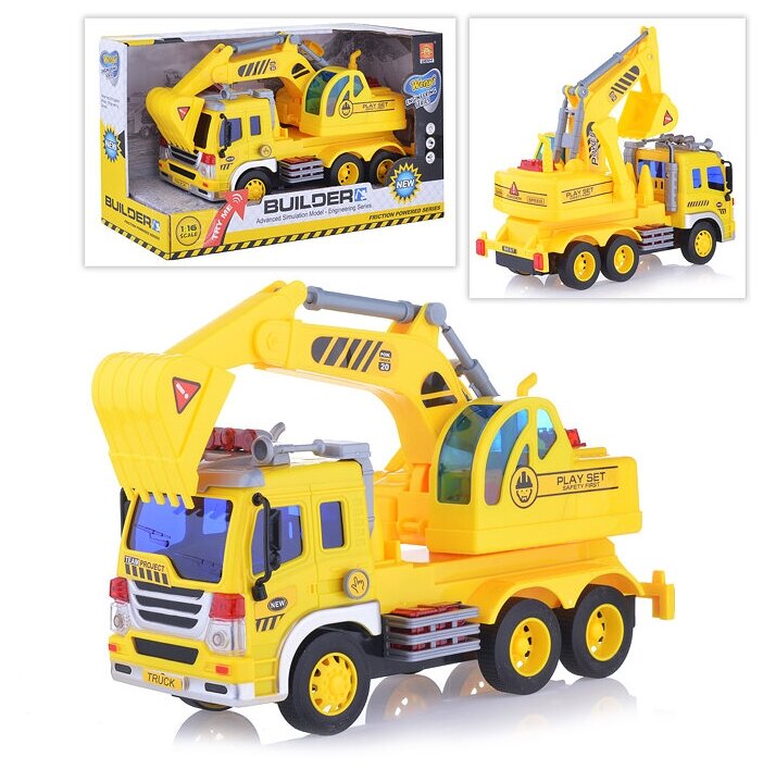 Экскаватор инерционный, с реалистичными звуковыми с световыми эффектами. Механическим воздействием, детали машинки приводятся в движение, что создает реалистичные действия реально работающей машины спецтехники.