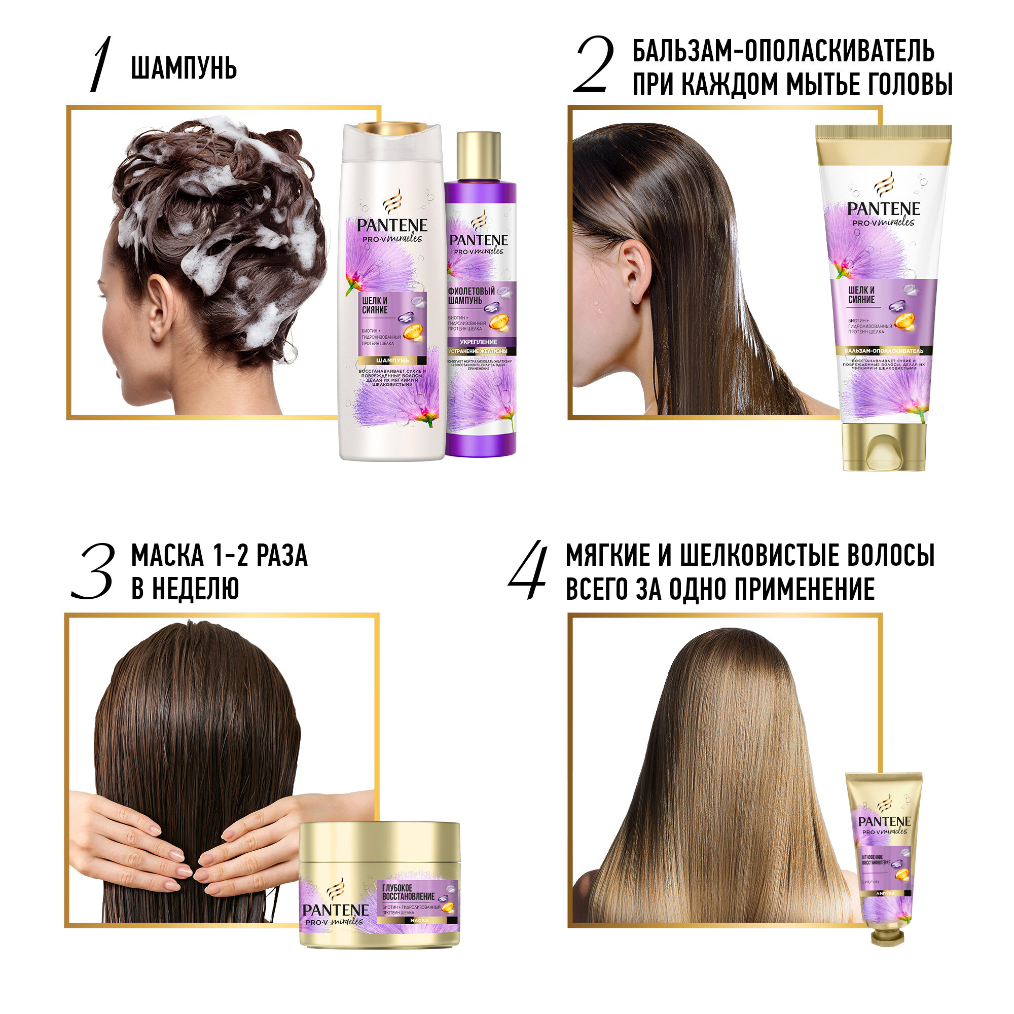 Серия "Шёлк и сияние" сочетает в себе силу научной формулы Pro-V с биотином с гидролизованным протеином шелка. Интенсивная маска для волос Pantene помогает восстановить сильно поврежденные, подвергшиеся чрезмерному воздействию или осветленные волосы, делая их мягкими как шелк. Pantene - это высокопитательная формула Pro-V для волос, которые нуждаются в чуде. Формула Pro-V протестирована Швейцарским институтом витаминов.