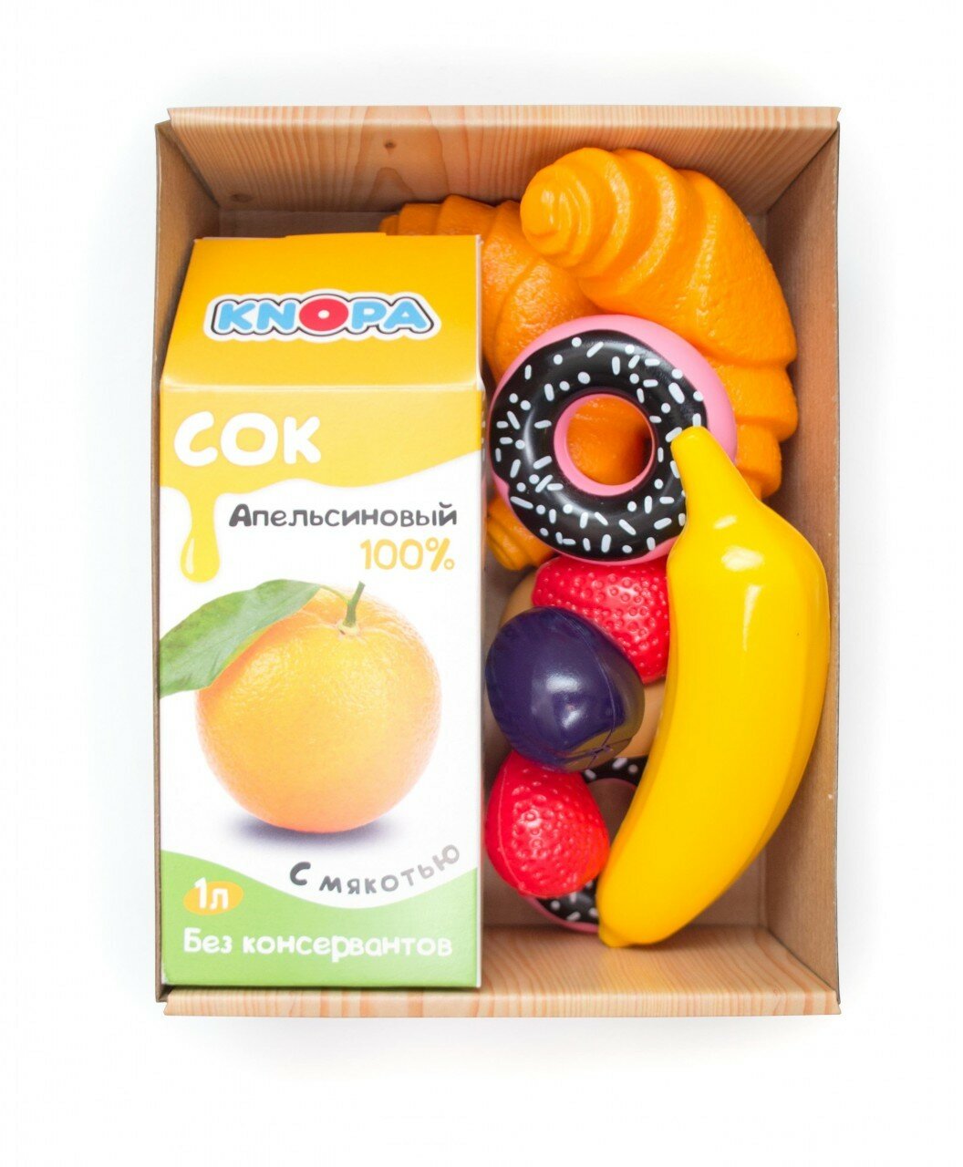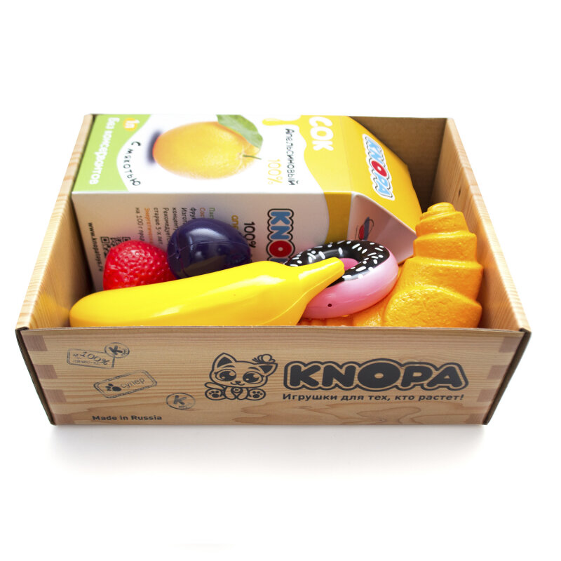 В игровой набор входит: банан – 1 шт. , клубника – 2 шт. , слива – 1 шт. , пончик – 3 шт. , круассан – 2 шт. , коробка "сок" – 1 шт. Предназначен для сюжетно-ролевой игры дома и в детском саду. Предметы имеют сходство с настоящими – поэтому дети получат удовольствие от игры с ними. После игры удобно всё сложить в коробочку (20 х 15 х 7см. ) и убрать на полку. Материал: пластмасса, картон. Для детей от 3-х лет.
