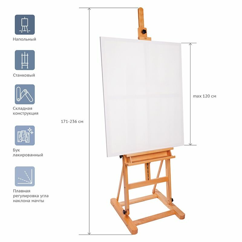 | Примечание | предназначен для станковой живописи, подходит для больших полотен, максимальная устойчивость благодаря широкому основанию, большая полка для кистей и красок, мачту можно наклонить на себя для проработки мелких деталей или сушки работ |
