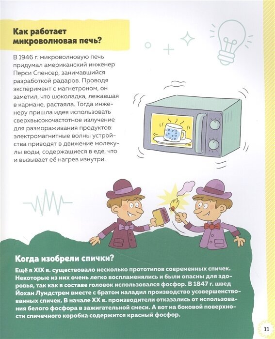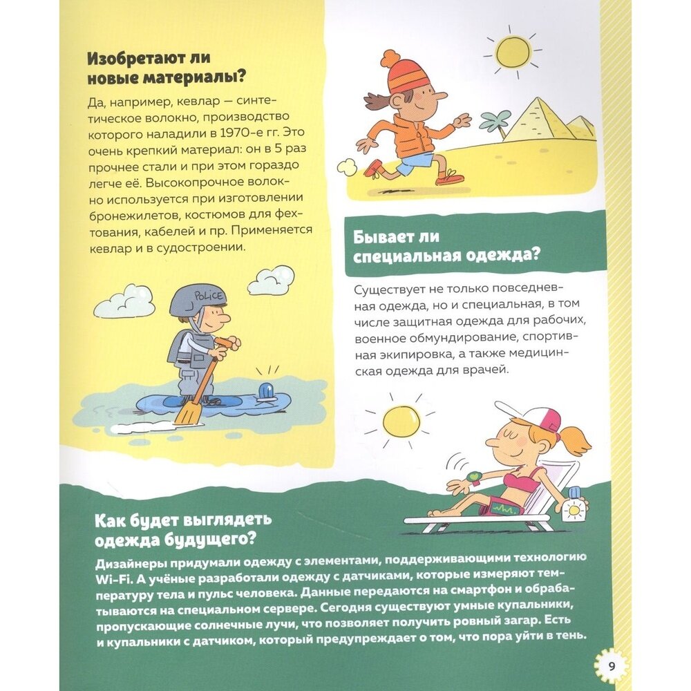 Покупала книгу для ребёнка, она ему очень понравилась. Сын узнал кучу интересных вещей. Когда и как люди стали носить одежду, как будет выглядеть одежда будущего. Что раньше использовали вместо холодильника, как работает микроволновая печь, почему подводные лодки не тонут и много ещё всего интересного. У книги увеличенный формат, крупный шрифт, очень много иллюстраций, мелованная бумага. Для любознательного ребёнка супер подарок.