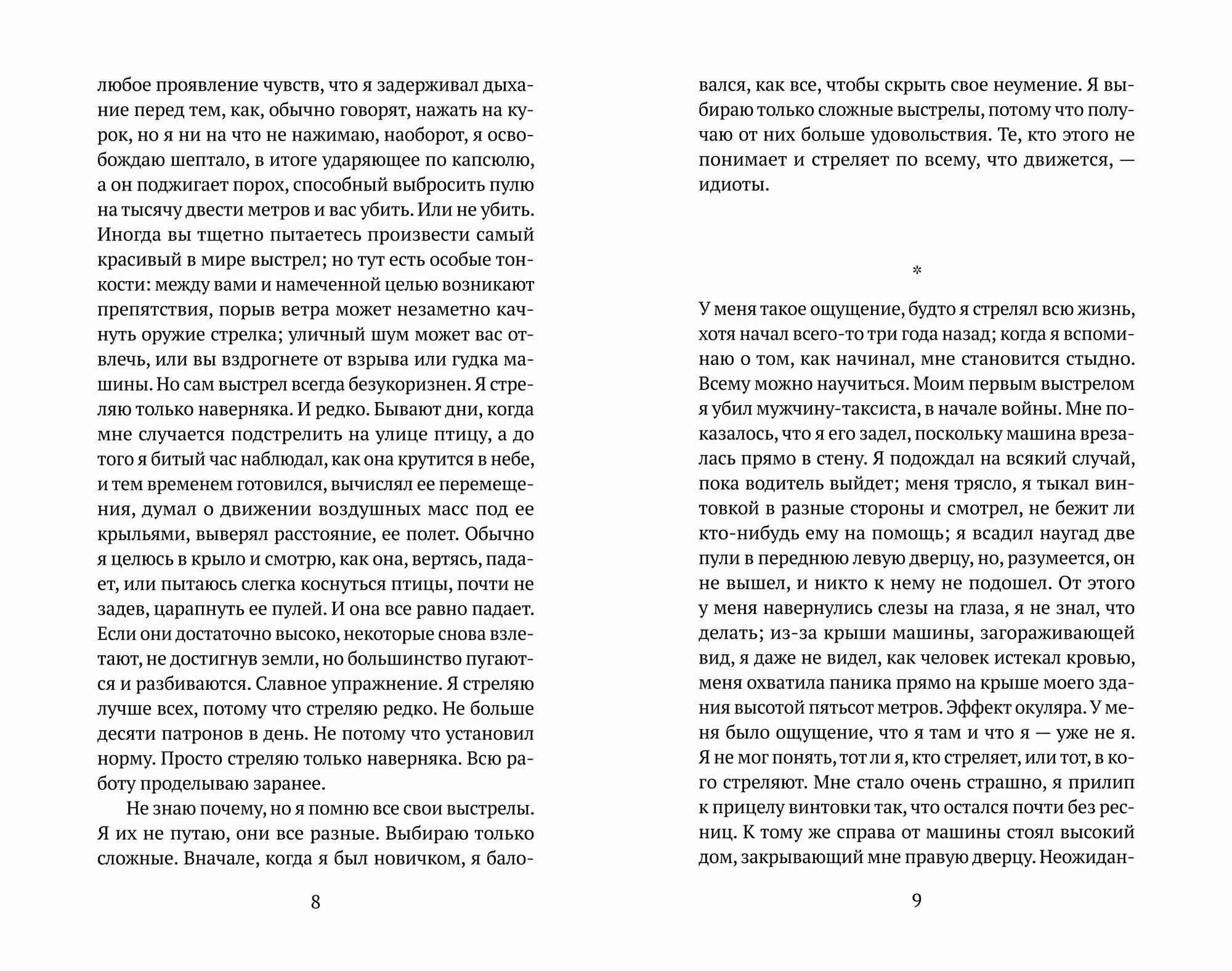 Перед началом чтения, я ожидала от истории другого. Думала, что это будет история отчаяния, глубоко травмированного человека, который знает все ужасы войны и не хочет туда возвращаться. По факту же, это история фанатика, который живет войной. Исповедь снайпера, исповедь безумца. Главный герой помешан на войне, он жаждет ее, он жаждет убивать. Он упивается своим величием, своей властью над жизнью людей и животных. Он не понимает, насколько разрушительны все его близкие отношения, он хочет владеть всем. Но жизнь - сложная штука и за все в этом мире приходиться платить. -