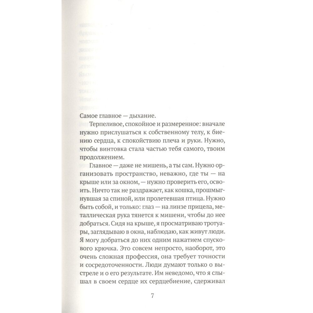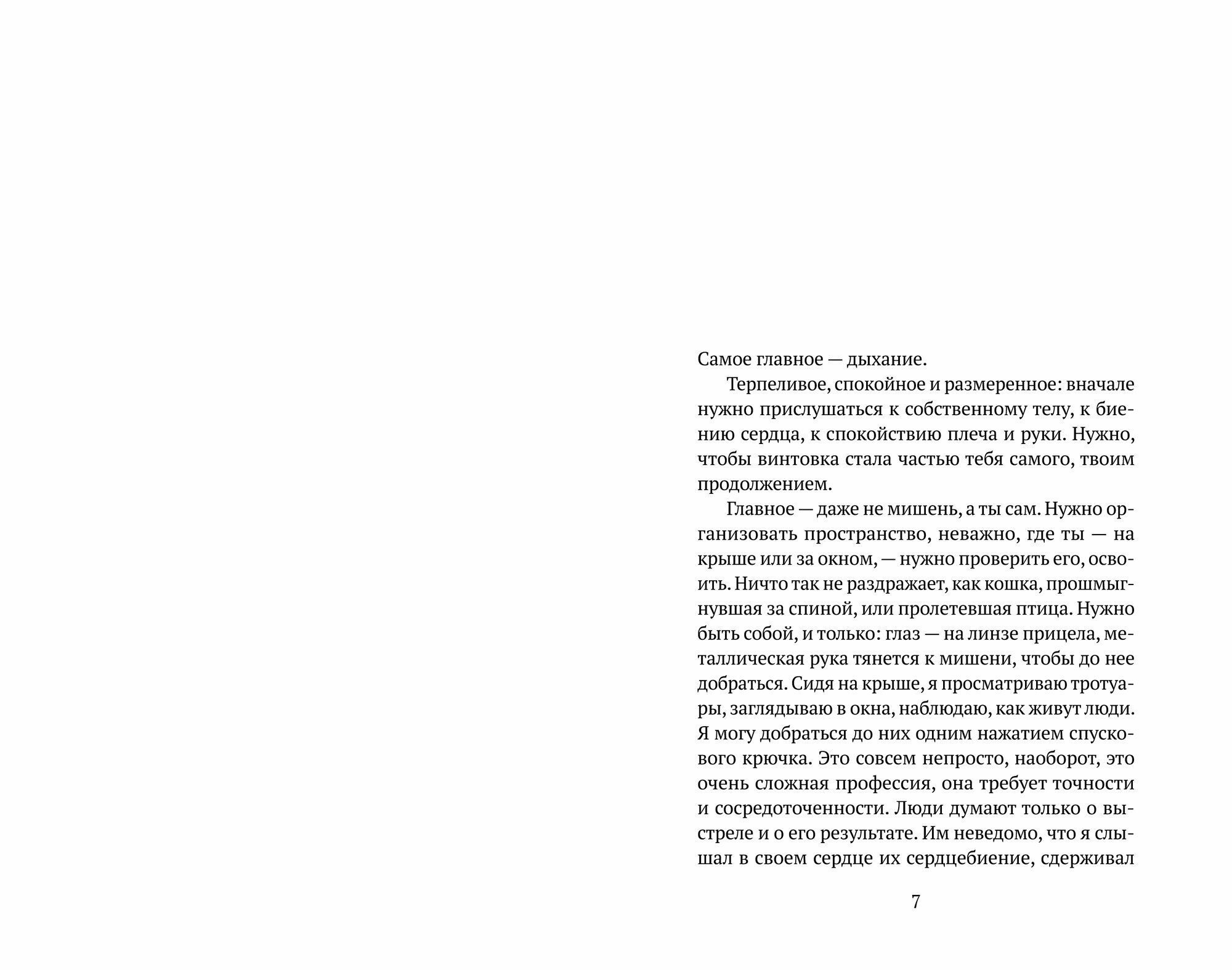 Главный герой этой притчевой повести стоит на краю пропасти, шаг в которую превратит его из запутавшегося мальчишки в мёртвого внутри мужчину. Сделает ли он этот шаг или, наоборот, найдёт в себе силы отойти подальше? Вот только волноваться читателю приходится вовсе не за распахнувшего перед ним душу рассказчика, а за юную Мирну, которой не повезло стать возлюбленной человека, променявшего способность любить на те самые совершенные выстрелы. Ведь с того момента, как она попала в прицел его взгляда, она уже была обречена.