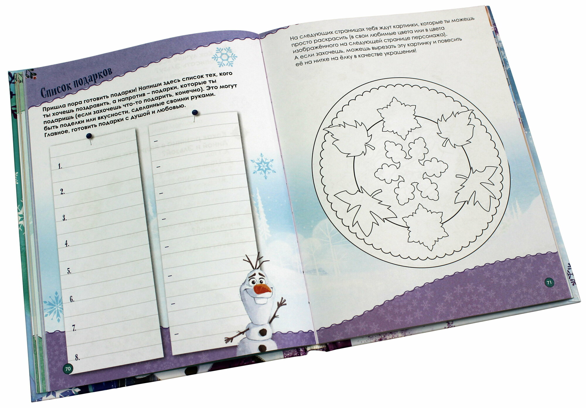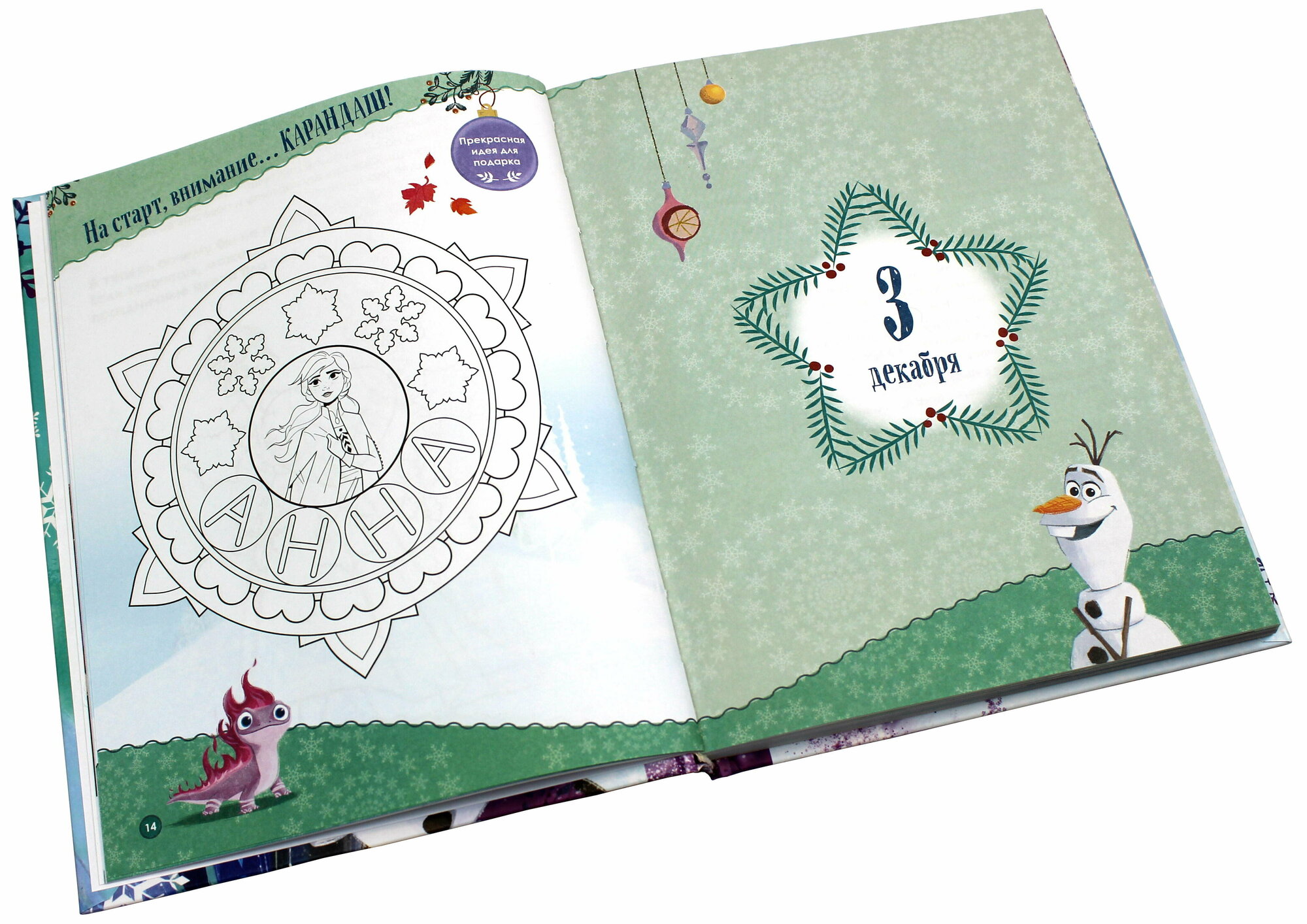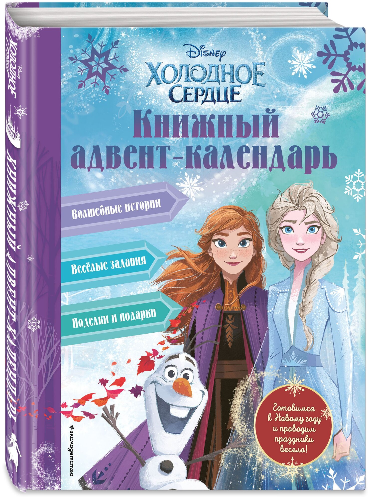 В ней вас ждёт маленькое приключение на каждый день декабря — от доброй истории о любимых героях мультфильма «Холодное сердце» до весёлых лёгких заданий, идей подарков и поделок и самых простых рецептов сладостей. Всего 15—20 минут в день, и ожидание Нового года станет не менее радостным и волшебным, чем сам праздник! И, вероятно, даже создаст новую семейную традицию.