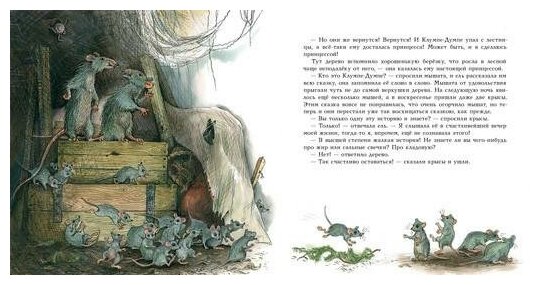 Рассказ показался очень грустным. Соглашусь, что одна из основных идей книги в том, что нужно ценить настоящий момент. Но я увидела еще парочку интересных мыслей. К примеру, непонимание между старыми крысами и елью. Ель рассказывает о прекрасном вечере, о волшебной сказке, о лесе, а старые крысы хотят слышать о еде. При этом молодые крысы слушают истории ели с интересом. Мне кажется, это вопрос непонимания между поколениями и представителями разных сословий.