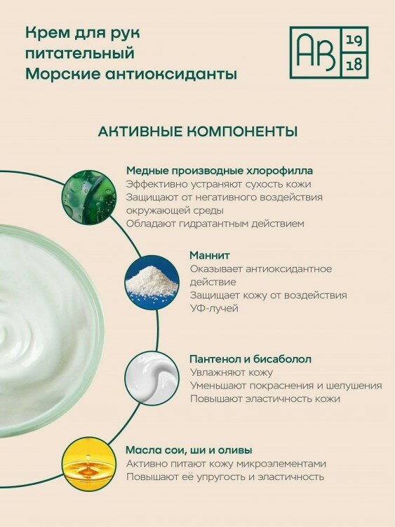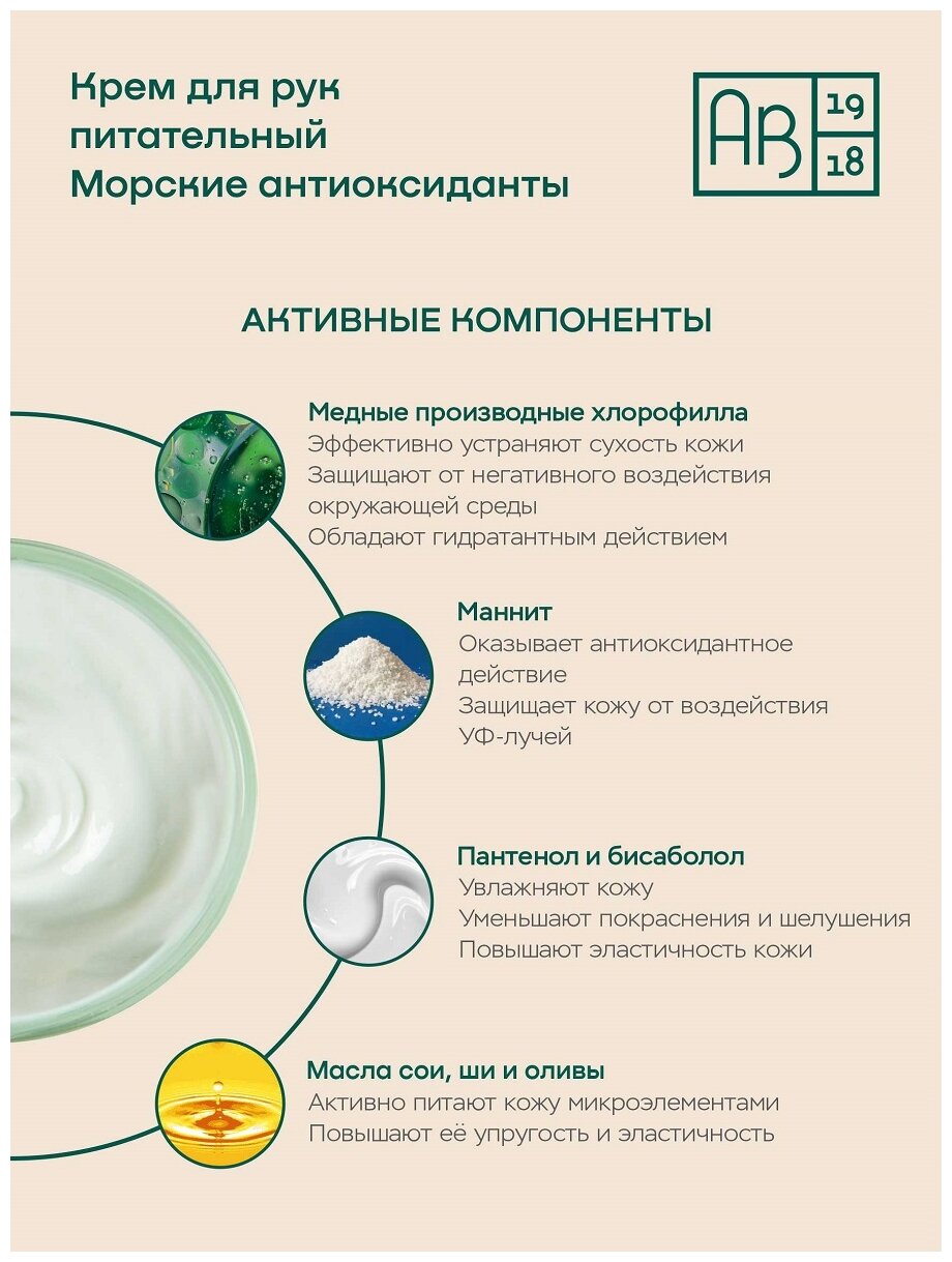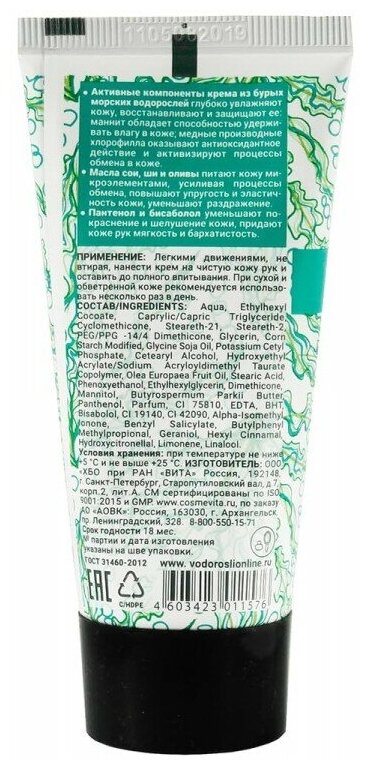 Интенсивное увлажнение, активное питание, антиоксидантная защита. Активные компоненты крема из бурых морских водорослей глубоко увлажняют кожу, восстанавливают и защищают её: Маннит обладает способностью удерживать влагу в коже; медные производные хлорофилла оказывают антиоксидантное действие и активизируют процессы обмена в коже. Масло сои, ши и оливы питают кожу микроэлементами, усиливая процессы обмена, повышают упругость и эластичность кожи, уменьшают раздражение. Пантенол и бисаболол уменьшают покраснение и шелушение кожи, придают коже рук мягкость и бархатистость. Применение: Легкими движениями, не втирая, нанести крем на чистую кожу рук и оставить до полного впитывания. При сухой и обветренной коже рекомендуется использовать несколько раз в день.