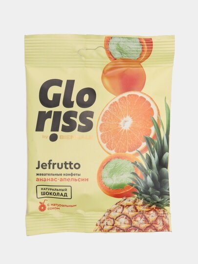 Жевательные конфеты Gloriss Jefrutto Ананас-апельсин: летнее настроение и разнообразие вкусовПодарите себе и своим близким летнее настроение с жевательными конфетами Gloriss Jefrutto Ананас-апельсин. Эти конфеты станут отличным дополнением к дружеским встречам и семейным посиделкам, а также послужат приятным и ненавязчивым перекусом вне дома.Разнообразие вкусов: попробуйте JEFRUTTO со вкусом сочного ананаса и услышьте, как яркими акцентами расцветает сладкий апельсин, таящийся в жевательном центре.Безопасность и качество: конфеты Gloriss Jefrutto не содержат ГМО, глютен, искусственные добавки, искусственные красители, что делает их безопасными для здоровья.Удобная упаковка: каждая упаковка Easy pack содержит 4 конфеты весом 35 грамм, что позволяет наслаждаться вкусом конфет в компании друзей или семьи.Состав конфет включает натуральный белый шоколад, сахар, кукурузный крахмал, глянцеватель, пенообразователь – экстракт мыльного корня, концентрированный апельсиновый сок, лимонную кислоту, натуральные красители, медные комплексы хлорофиллов, экстракт паприки и ароматизаторы.Выбирая жевательные конфеты Gloriss Jefrutto Ананас-апельсин, вы получаете не только вкусные и разнообразные конфеты, но и качественный продукт, который принесет радость и удовольствие вам и вашим близким.