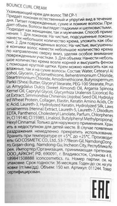 | Состав | Water, Cetearyl Alcohol, Glycerin, Cyclomethicone, Behentrimonium Chloride, Steartrimonium Chloride, Amodimethicone, Butyrospermum Parkii (Shea) Butter, Glyceryl Stearate, PEG-100 Stearate, Prunus Amygdalus Dulcis (Sweet Almond) Oil, Argania Spinosa Kernel Oil, Caprylyl Glycol, Glycyrrhiza Uralensis (Licorice) Root Extract, Glycyrrhiza Uralensis (Licorice) Root Extract, Simmondsia Chinensis (Jojoba) Seed Oil, Hydrolyzed Wheat Protein, Collagen, Elastin, Keratin Amino Acids, Citric Acid, Laureth-3, Hydrolyzed Keratin, Hydrolyzed Silk, Lawsonia Inermis (Henna) Extract, Laureth-5, Laureth-7, Disodium EDTA, Panthenol, Cholesteryl Lanolate, Parfum, Chlorphenesin, CI 19140, CI 15985. |