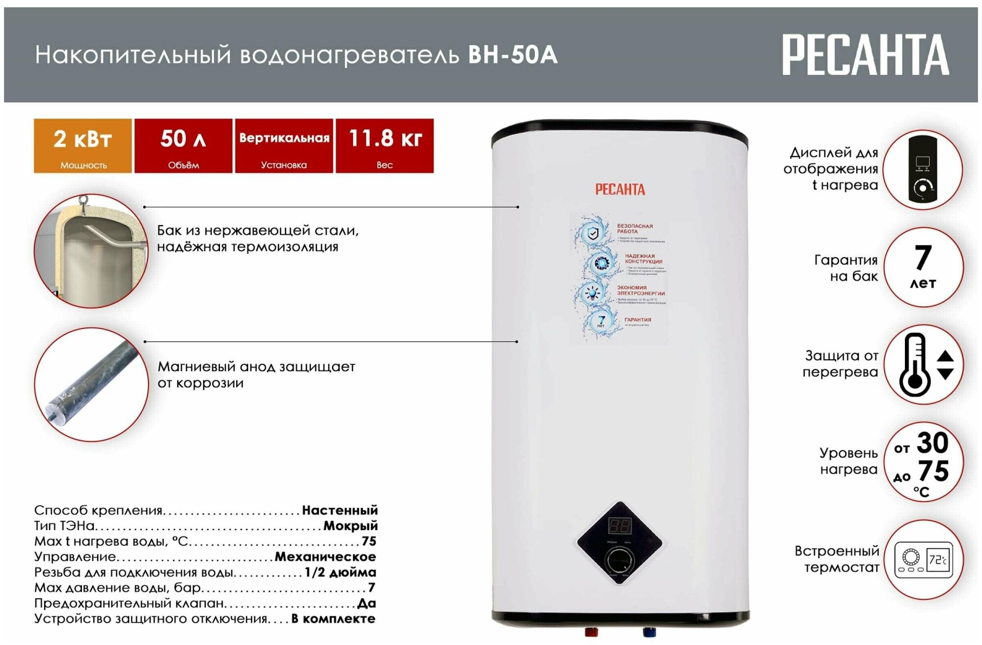 Электрический водонагреватель накопительного типа ВН-50А Ресанта предназначен для нагрева холодной воды, поступающей в него из водопровода. Используется в бытовых целях в местах постоянного и временного проживания; в гостиницах и других жилых помещениях.