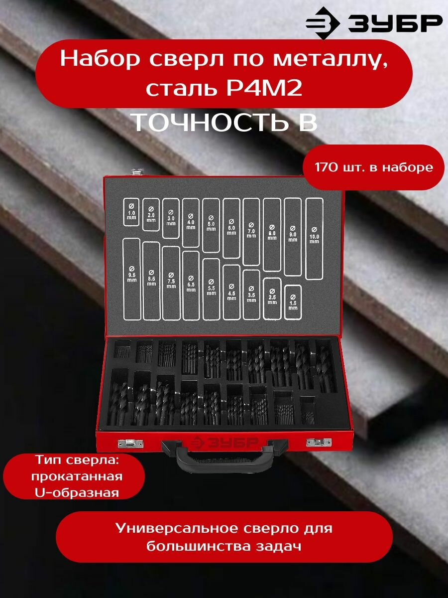 ЗУБР МАСТЕР 170шт(1-10мм), Набор сверл по металлу, сталь Р4М2, класс В, мет.бокс