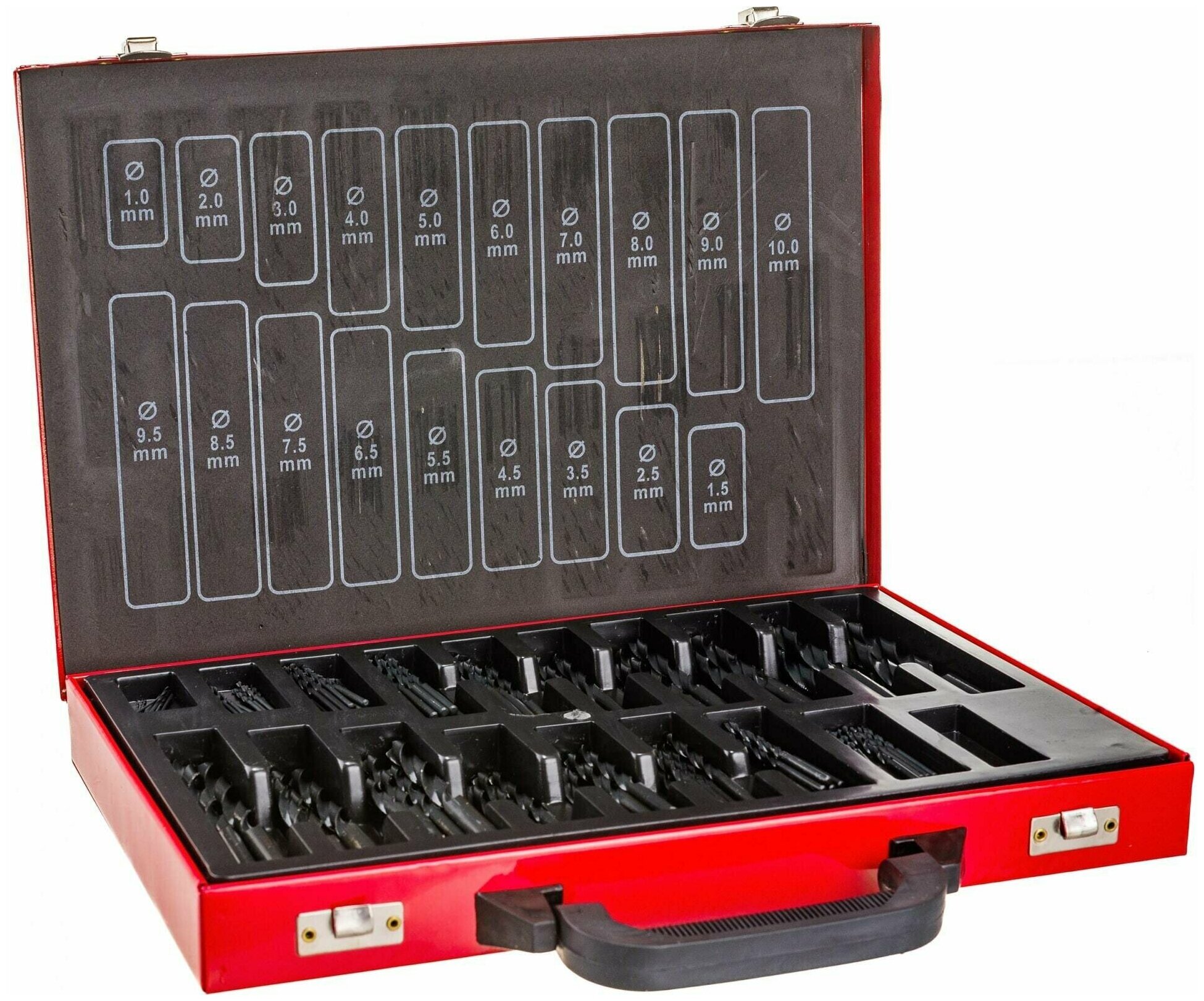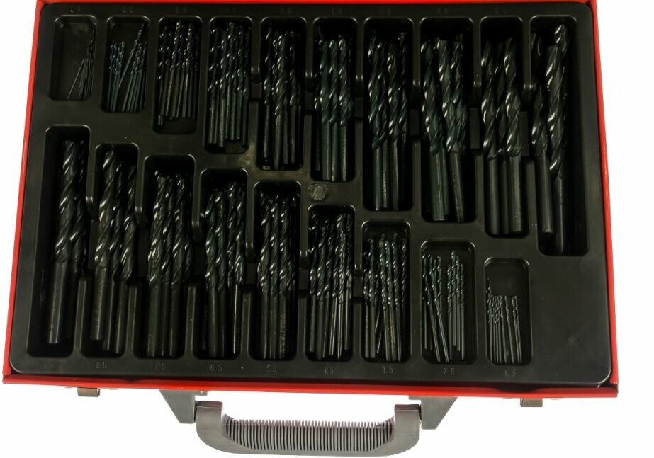 | Размер сверл в наборе, мм | 1 мм (10 шт), 1.5 мм (10 шт), 2 мм (10 шт), 2.5 мм (10 шт), 3 мм (10 шт), 3.5 мм (10 шт), 4 мм (10 шт), 4.5 мм (10 шт), 5 мм (10 шт), 5.5 мм (10 шт), 6 мм (10 шт), 6.5 мм (10 шт), 7 мм (10 шт), 7.5 мм (10 шт), 8 мм (10 шт), 8.5 мм (5 шт), 9 мм (5 шт), 9.5 мм (5 шт), 10 мм (5 шт) |