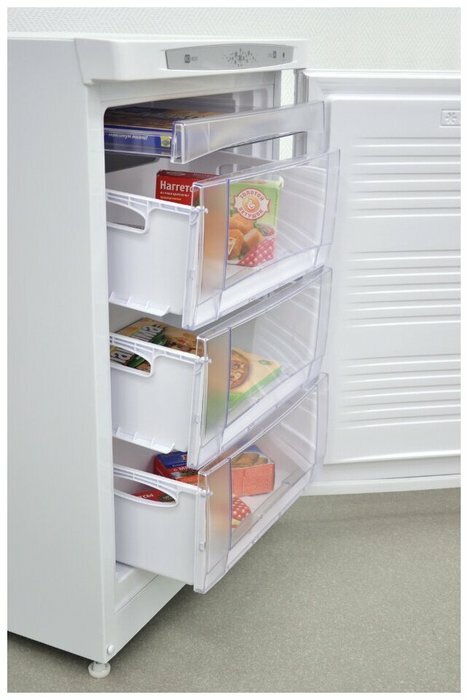Ножки регулируются по высоте и помогут ровно выставить морозильник относительно пола. Дверь с накладной ручкой имеет возможность перенавешивания на другую сторону для комфортного открывания и установки модели в удобном месте. Корпус морозильника выполнен в белом цвете.