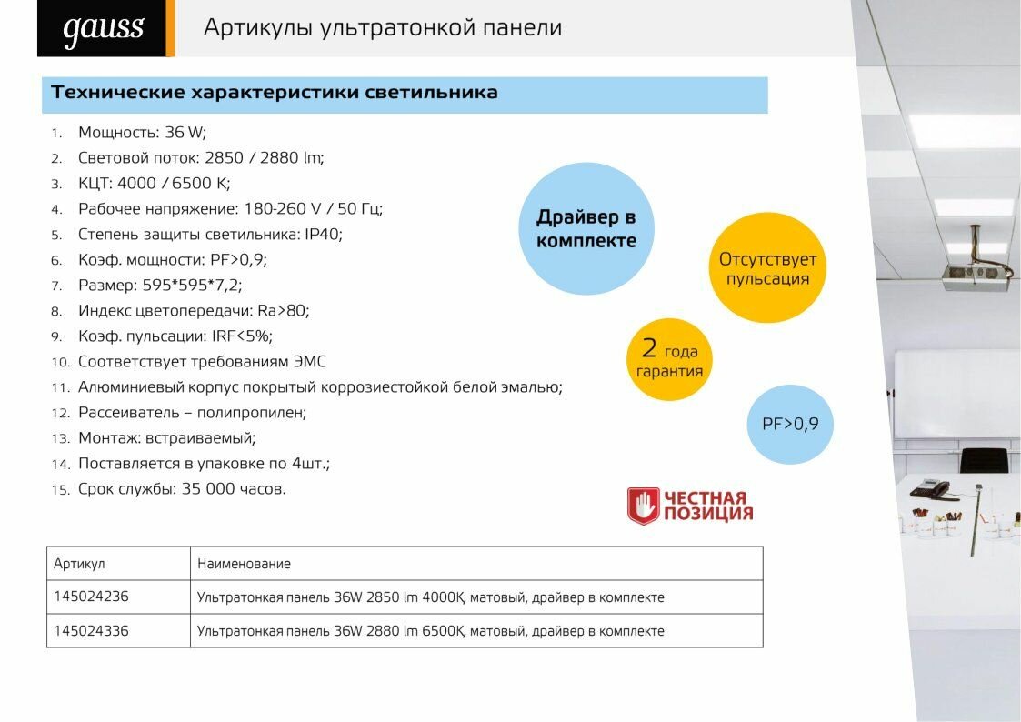 Светодиодная панель gauss 145024336 LED 36 Вт 6500 холодный белый цвет арматуры: белый цвет плафона: белый 36W 2880лм 6500K