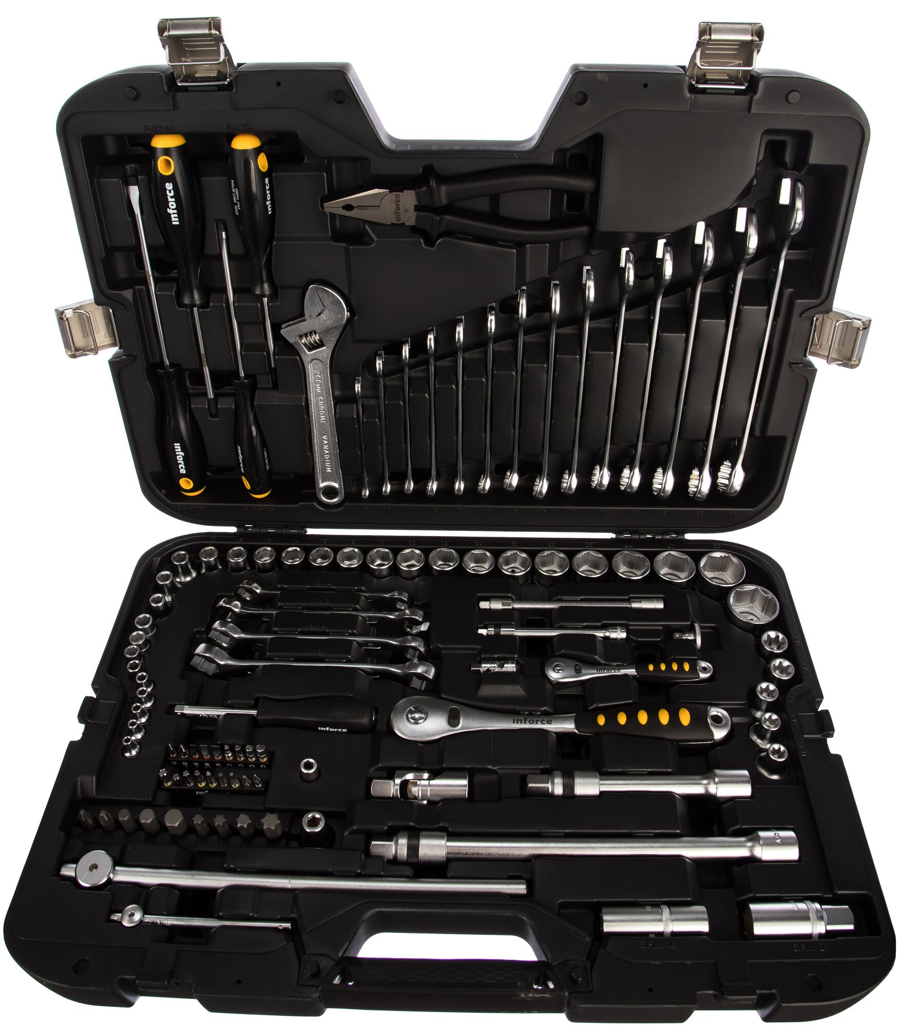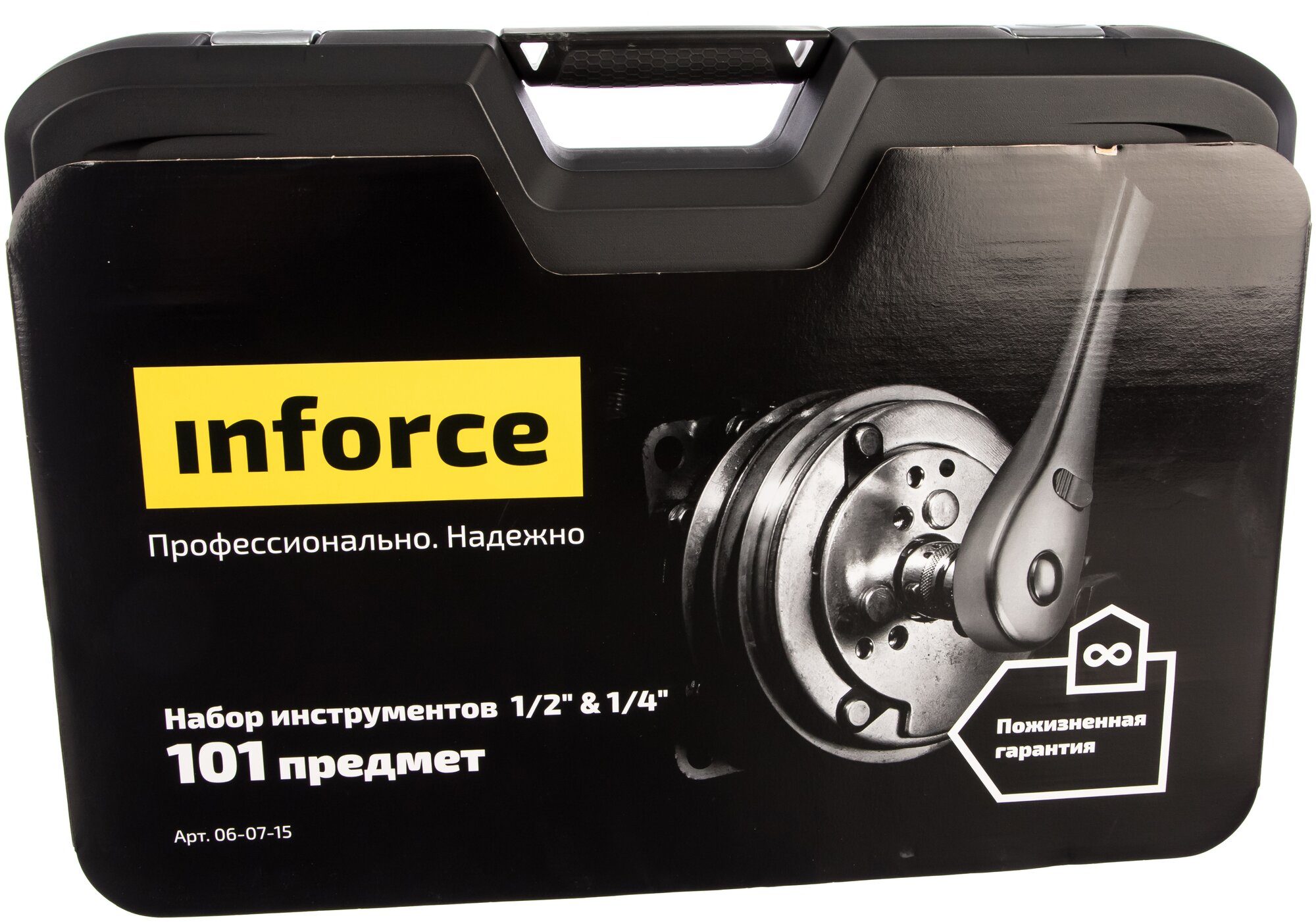 Набор инструментов Inforce 101 предмет 1/2 дюйма и 1/4 дюйма 06-07-15 представляет собой профессиональный комплект для широкого спектра монтажных и демонтажных работ. Применяется в автомастерских и на станциях технического обслуживания. Инструменты выполнены их прочной стали, поэтому отличаются долговечностью и механической износостойкостью. Перед использованием рекомендуется произвести 25 циклов вращения трещоточного механизма - для распределения смазки по всей поверхности механизма.