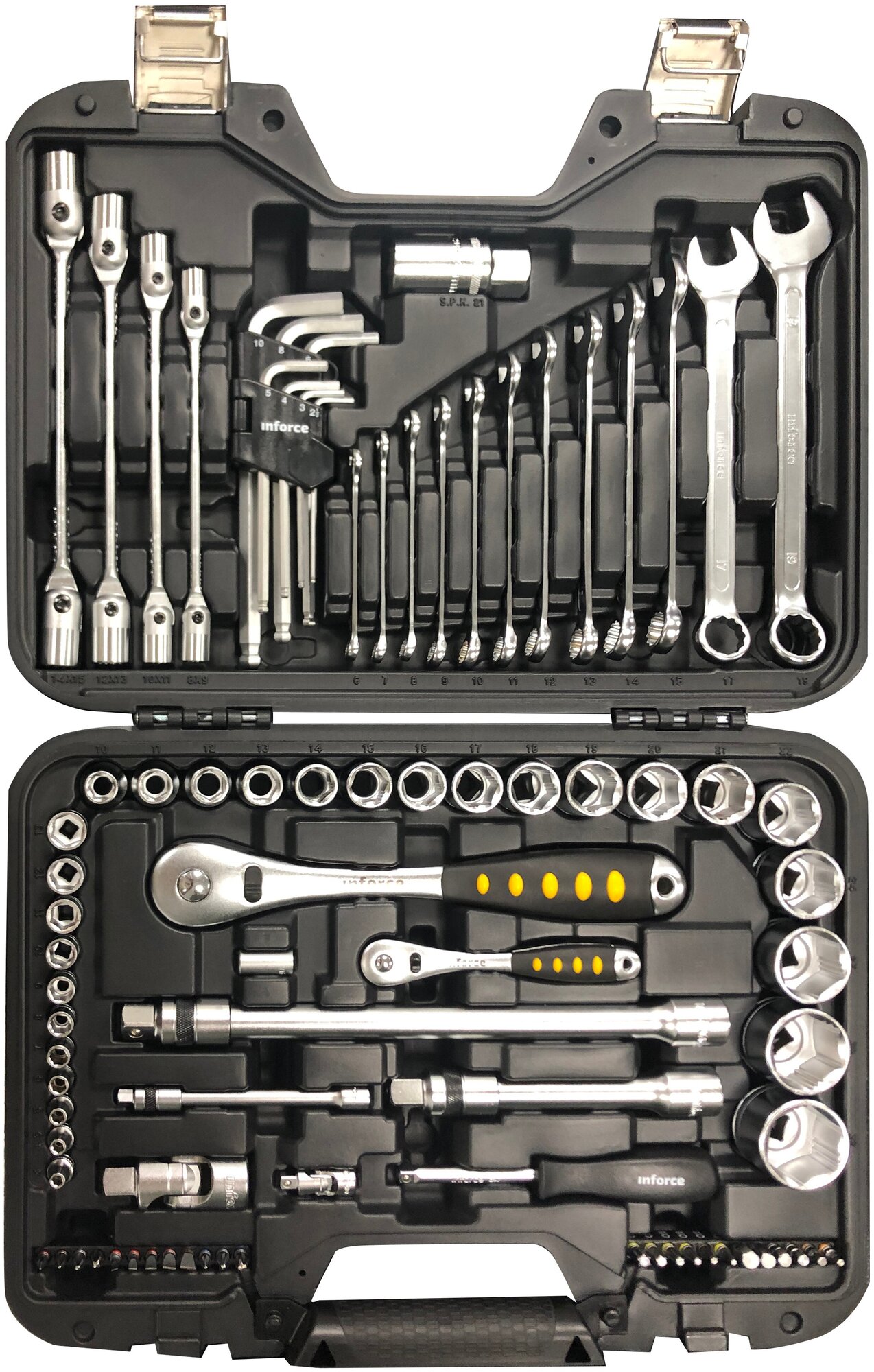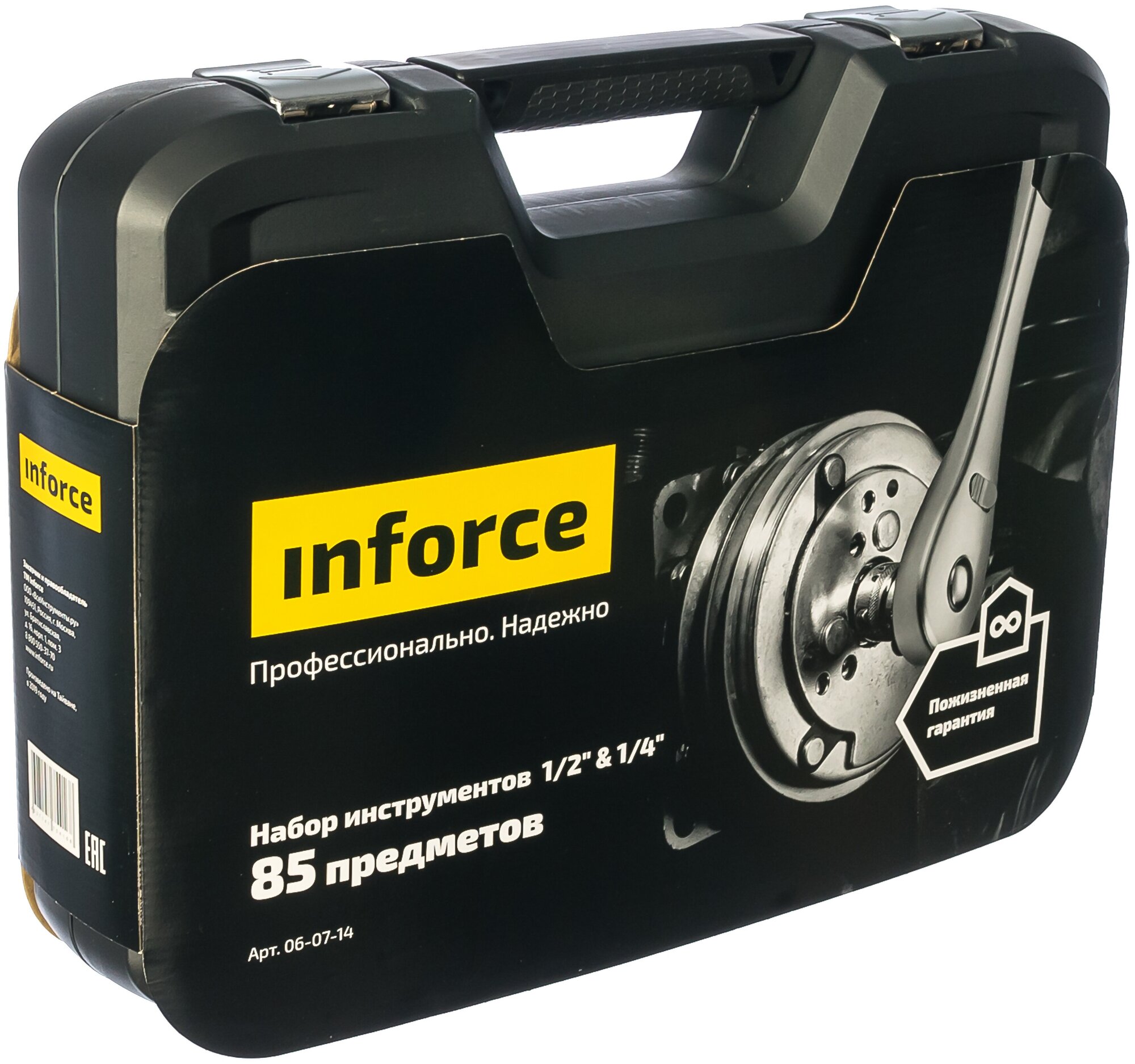 | Прочие особенности и свойства | Набор инструментов Inforce 85 предметов 1/2", 1/4" Inforce 06-07-14 - многофункциональный комплект, предназначенный для работ с крепежом. Уникальная запатентованная конструкция трещотки гарантированно выдерживает высокие нагрузки. Улучшенный профиль торцевых головок успешно справляется с крепежом, грани которого деформированы на 85%., , Комбинированные ключи выполнены методом цельной ковки и выдерживают высокие нагрузки., , Перед использованием рекомендуется произвести 25 циклов вращения трещоточного механизма - для распределения смазки по всей поверхности механизма., Пожизненная гарантия., Уникальная запатентованная конструкция трещотки., Карданный шарнир имеет угол поворота до 90°., Улучшенный профиль головки., Быстросъемный механизм удлинителей., Удобный кейс. |
