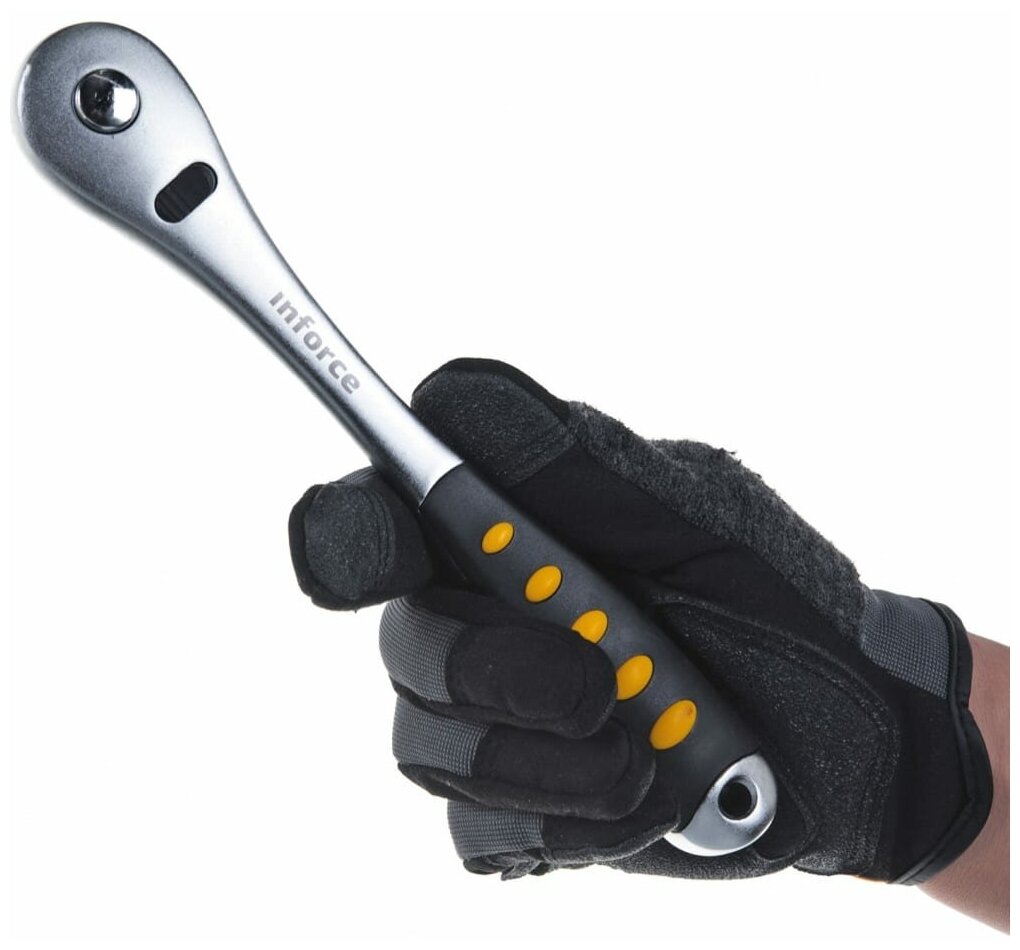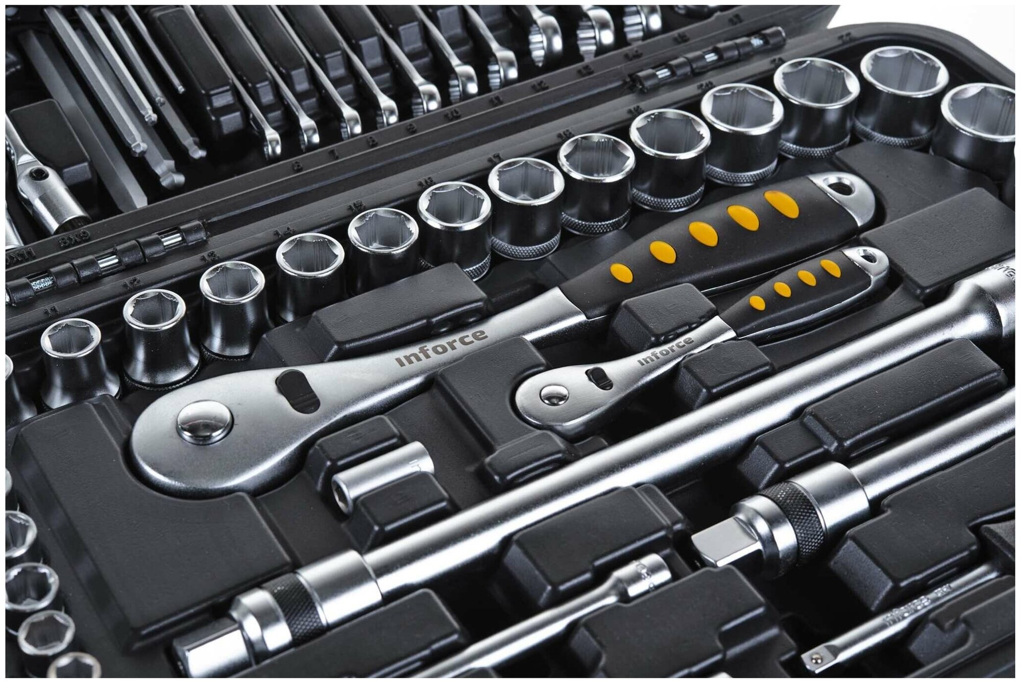 Набор инструментов Inforce 85 предметов 1/2", 1/4" Inforce 06-07-14 - многофункциональный комплект, предназначенный для работ с крепежом. Уникальная запатентованная конструкция трещотки гарантированно выдерживает высокие нагрузки. Улучшенный профиль торцевых головок успешно справляется с крепежом, грани которого деформированы на 85%. Комбинированные ключи выполнены методом цельной ковки и выдерживают высокие нагрузки. Перед использованием рекомендуется произвести 25 циклов вращения трещоточного механизма - для распределения смазки по всей поверхности механизма.