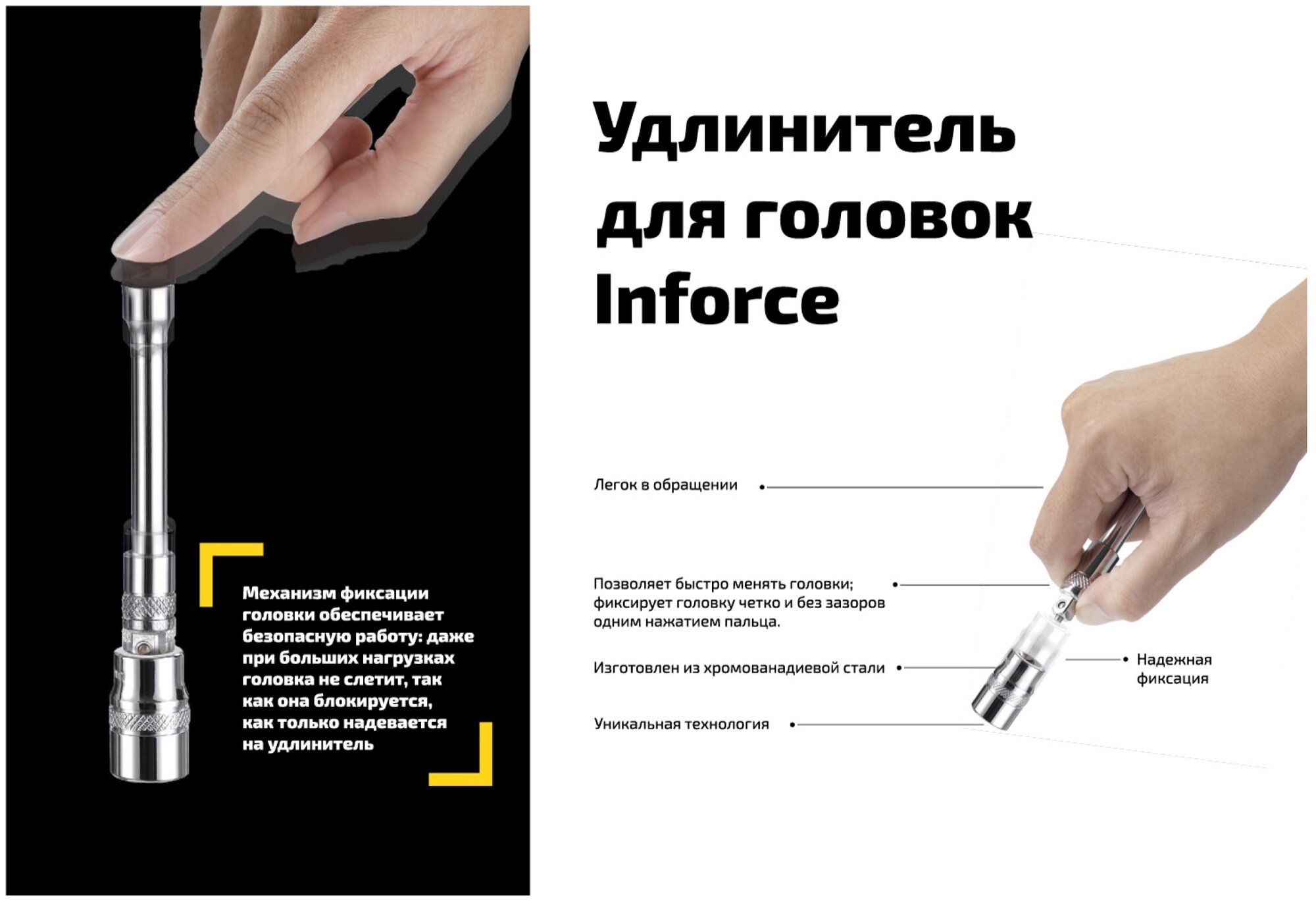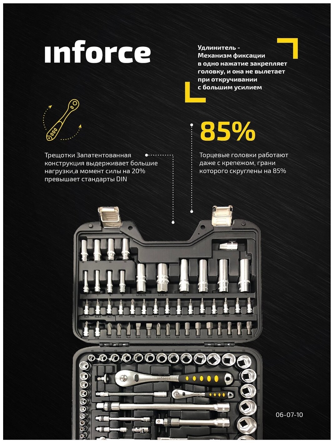 | Прочие особенности и свойства | Уникальная запатентованная конструкция трещотки., Карданный шарнир имеет угол поворота до 90°., Улучшенный профиль головки., Быстросъемный механизм удлинителей., Специальная насадка для увеличения скорости откручивания/закручивания крепежа., Удобный кейс Inforce 06-07-10;, Инструменты изготовлены из CrV стали. |