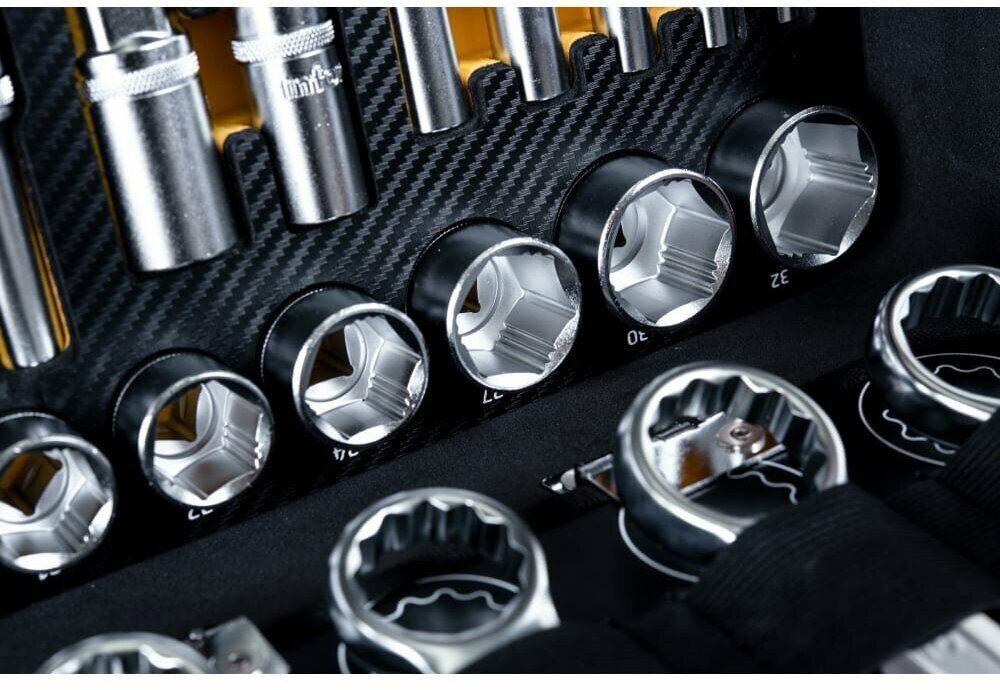 | Подробный состав комплекта | 1/4" Торцевые головки – 4; 4,5; 5; 6; 7; 8; 9; 10; 11; 12 мм., 1/2" Торцевые головки – 8; 9; 10; 11; 12; 13; 14; 15; 16; 17; 18; 19; 21; 22; 24; 27; 30; 32 мм., 1/4" Удлиненные головки – 7; 8; 10; 12; 13 мм., 1/2" Удлиненные головки – 10; 12; 13; 14; 15; 17; 19 мм., 1/4" Головки Е-типа – E4; E5; E6; E7; E8., 1/2" Головки Е-типа – Е10; Е12; Е14; Е16; Е18; Е20; Е22; Е24., 1/2" Свечная головка с магнитом – 16 и 21 мм., 1/4" Удлинители для головок – 65; 115; 165 мм., 1/2" Удлинители для головок – 105; 155; 280 мм., 1/4" Гибкий удлинитель – 150 мм., 1/4" и 1/2" Карданные шарниры., 1/4" Т-образный вороток – 115 мм., 1/2" Т-образный вороток – 300 мм., 1/2" Шарнирный вороток – 375 мм., 1/4" Трещоточный ключ – 72 зубца., 1/2" Трещоточный ключ – 72 зубца., Набор имбусовых шестигранных ключей – 1,5; 2; 2,5; 3; 4; 5; 6; 8; 10 мм., Набор шестигранных ключей типа Torx – T10; Т15; Т20; Т25; Т27; Т30; Т40; Т45; Т50., Комбинированные ключи – 6; 7; 8; 9; 10; 11; 12; 13; 14; 15; 16; 17; 19; 21; 22; 24; 27; 30; 32 мм., Разрезные ключи – 8?10; 9?11; 12?13; 14?17; 17?19 - 5., Отвертки – PH1?75; PH2?38; PH2?100; SL5,5?75; SL6,5?38; SL6,5?100., Комбинированные пассатижи – 180 мм., Переставные клещи – 250 мм., Молоток – 500 г., Набор выколоток, кернов и зубил – 5 шт., Телескопическая рукоятка с магнитным держателем., Комбинированные пассатижи – 180 мм., Кейс. |