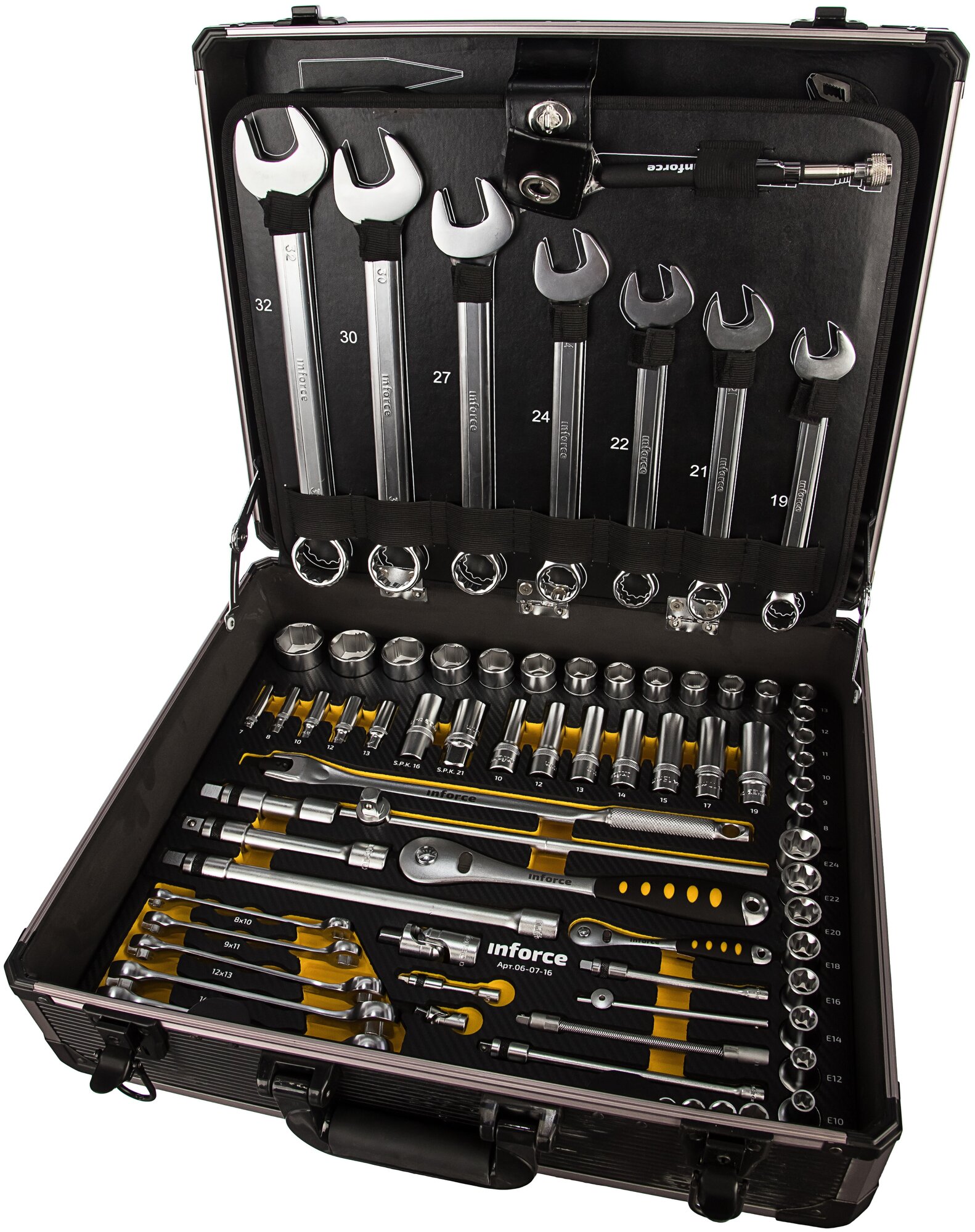 | Прочие особенности и свойства | Набор инструментов Inforce 127 предметов 1/2 дюйма и 1/4 дюйма 06-07-16 предназначен для монтажных, демонтажных и ремонтных работ в автосервисах и мастерских. В комплекте инструменты профессионального класса. Выполнены из прочной стали., , Набор поставляется в кейсе для удобного и компактного хранения., , Перед использованием рекомендуется произвести 25 циклов вращения трещоточного механизма - для распределения смазки по всей поверхности механизма. |