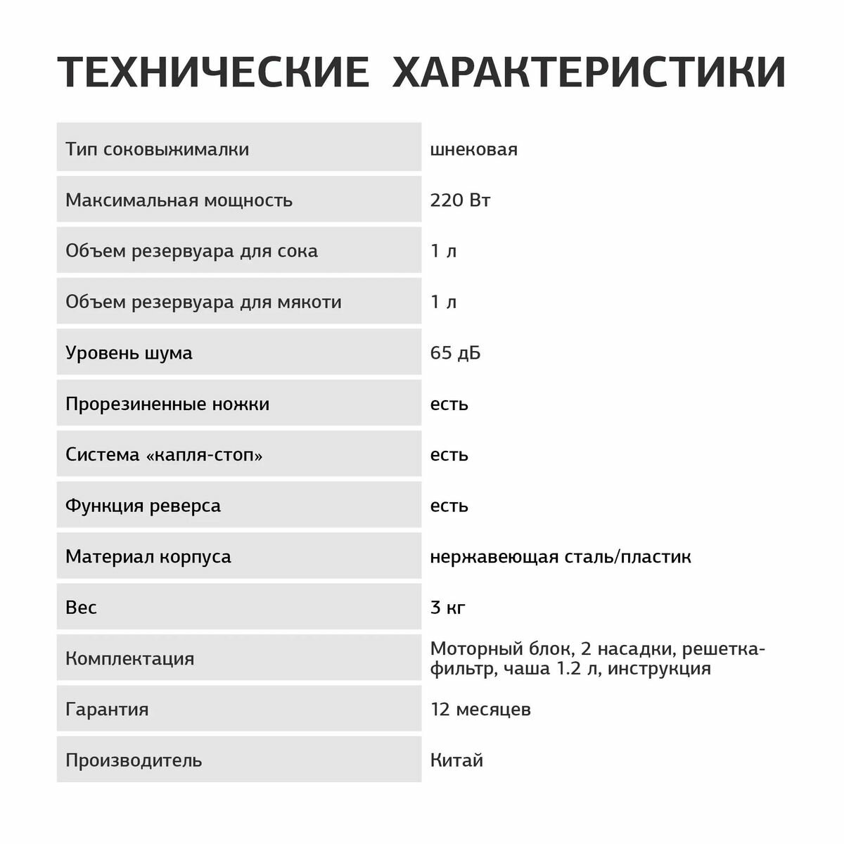 | Особенности | автоматический выброс мякоти, реверс, система «капля-стоп», система прямой подачи сока, автоматический выброс мякоти |