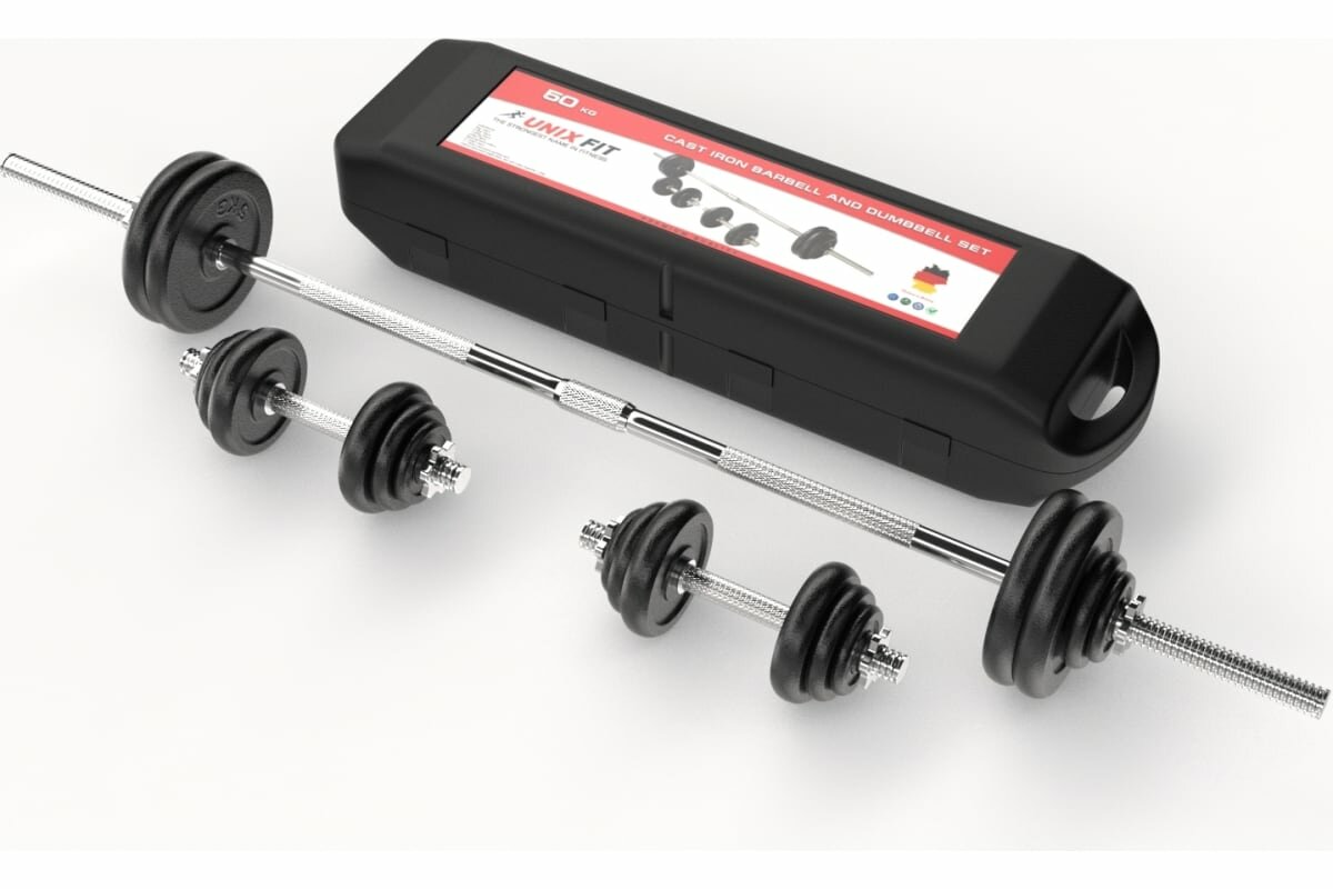 Набор состоит из двух гантелей и штанги общим весом 50 кг. Удобная разборная конструкция позволяет регулировать вес снарядов в процессе занятий.