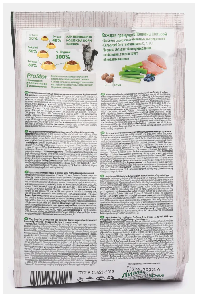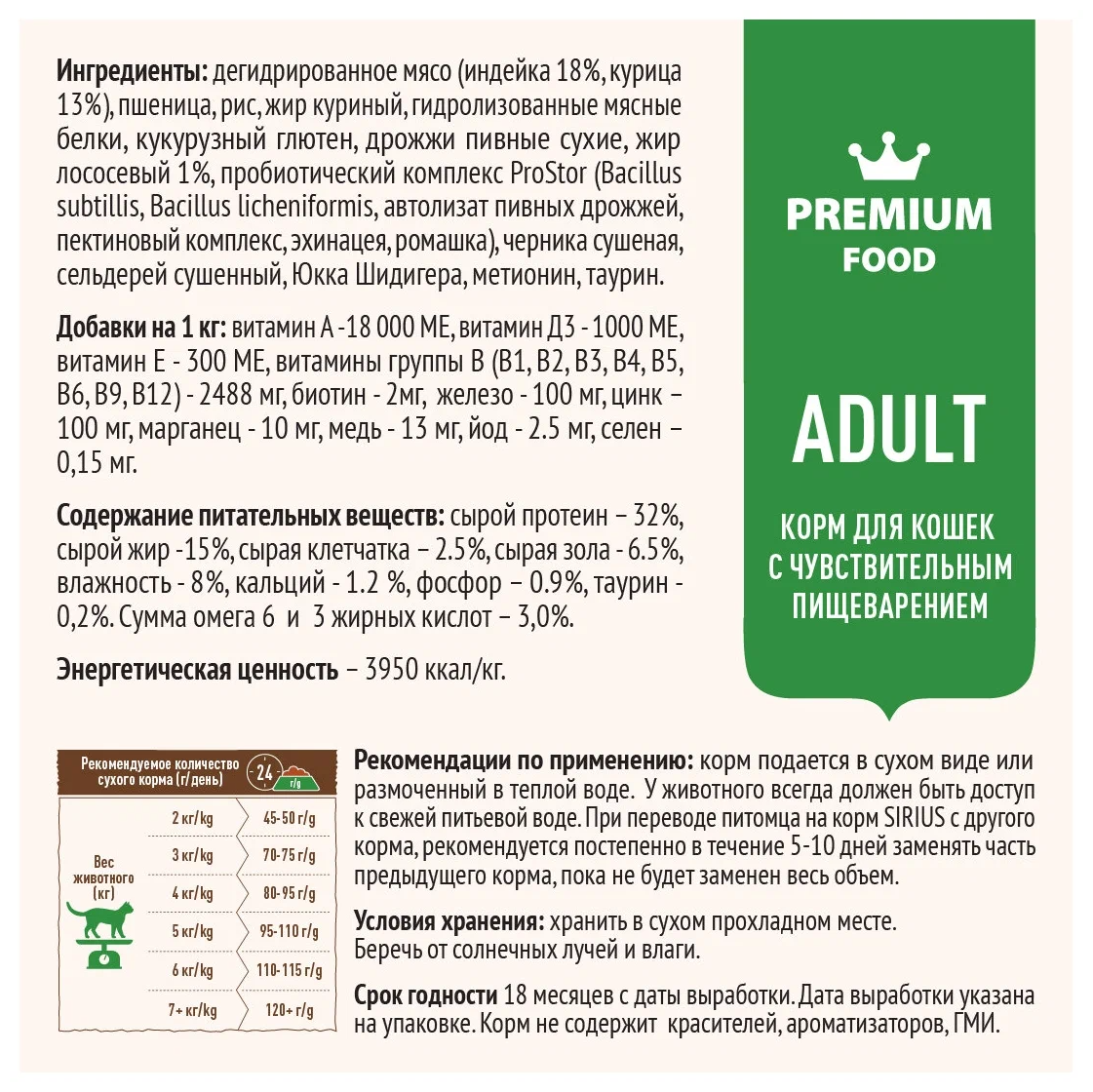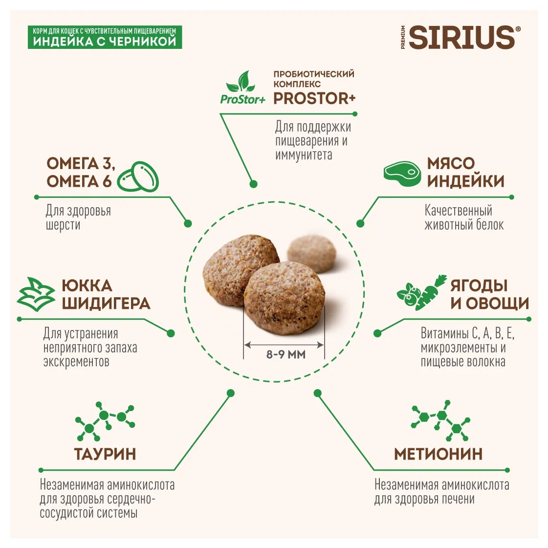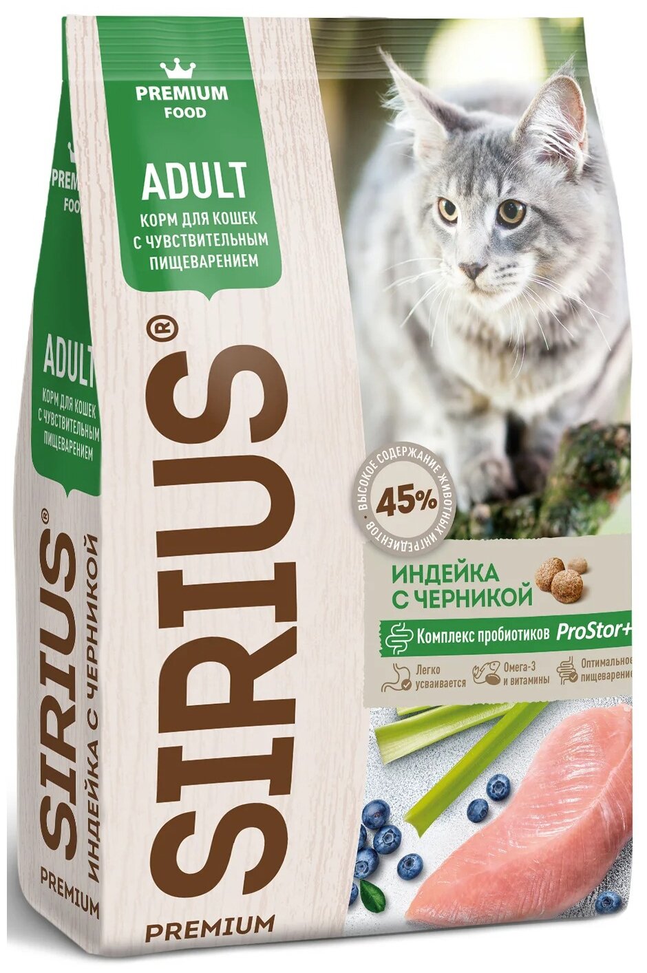 Сухой корм для кошек Sirius при чувствительном пищеварении с индейкой и черникой 15 кг
