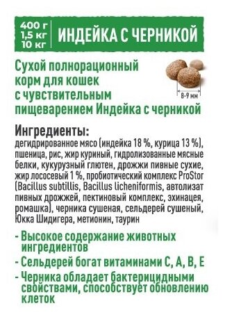 Дегидрированное мясо (индейка 18%, курица 13%), пшеница, рис, жир куриный, гидролизованные мясные белки, кукурузный глютен, дрожжи пивные сухие, жир лососевый 1%, пробиотический комплекс ProStor (Bacillus subtillis, Bacillus licheniformis, автолизат пивных дрожжей, пектиновый комплекс, эхинацея, ромашка), черника сушеная, сельдерей сушенный, Юкка Шидигера, метионин, таурин.