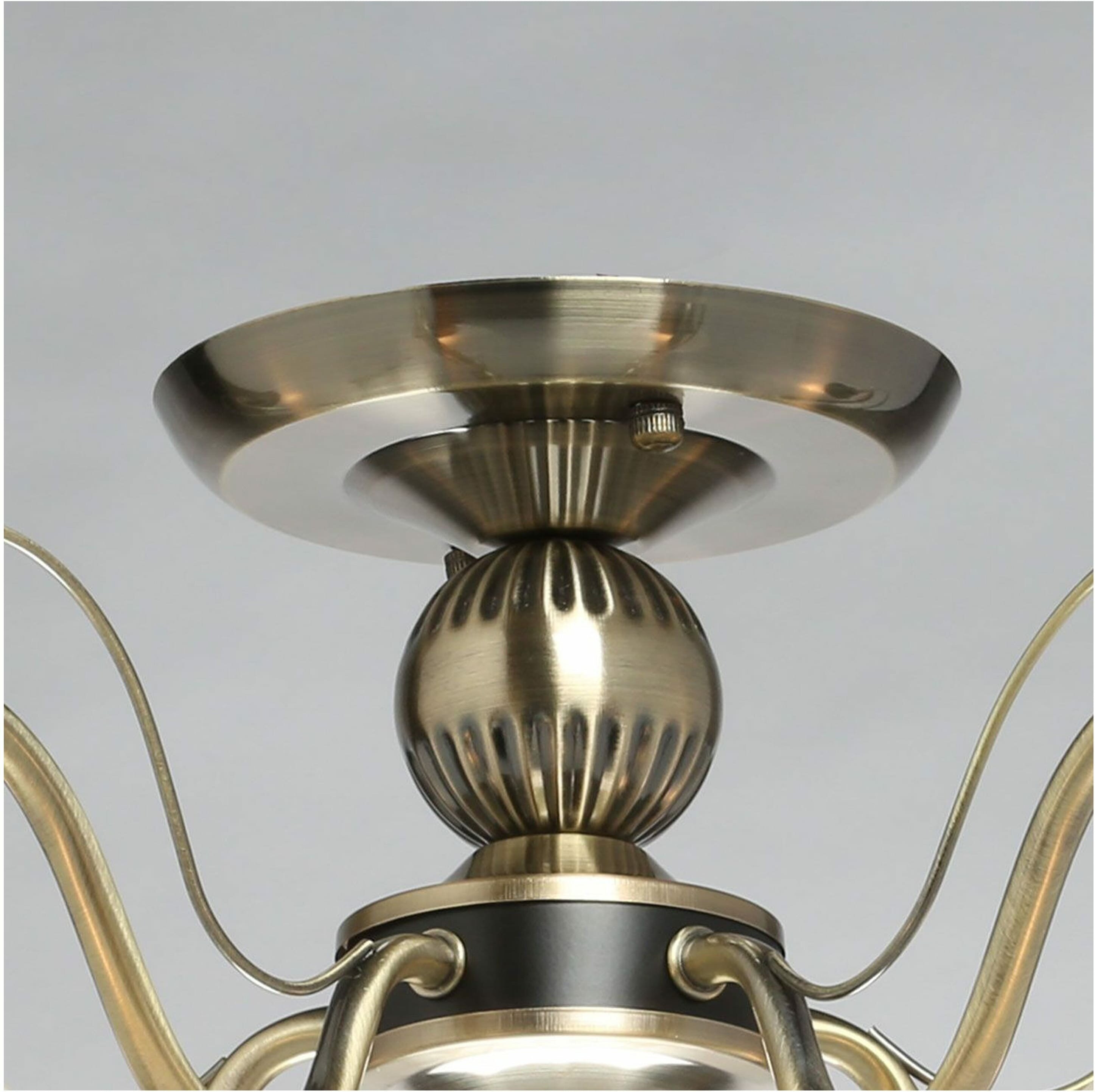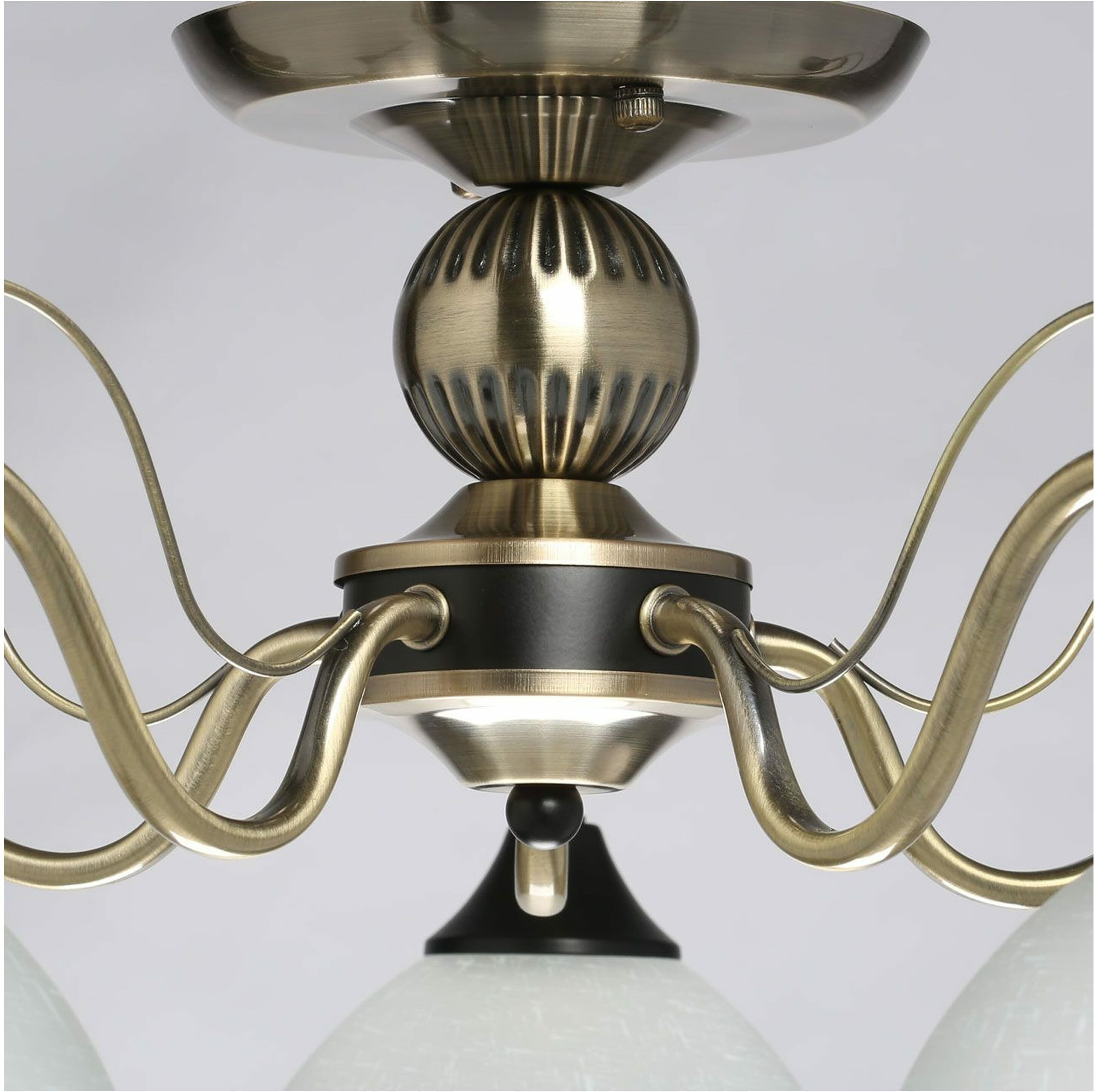 Дизайн в стиле неоклассики в тренде. Актуальная комбинация металлов цвета античной бронзы и черного. Рожки с металлическим декором добавляют легкости модели. Стеклянные матовые плафоны с рисунком обеспечивают мягкий световой пототок.