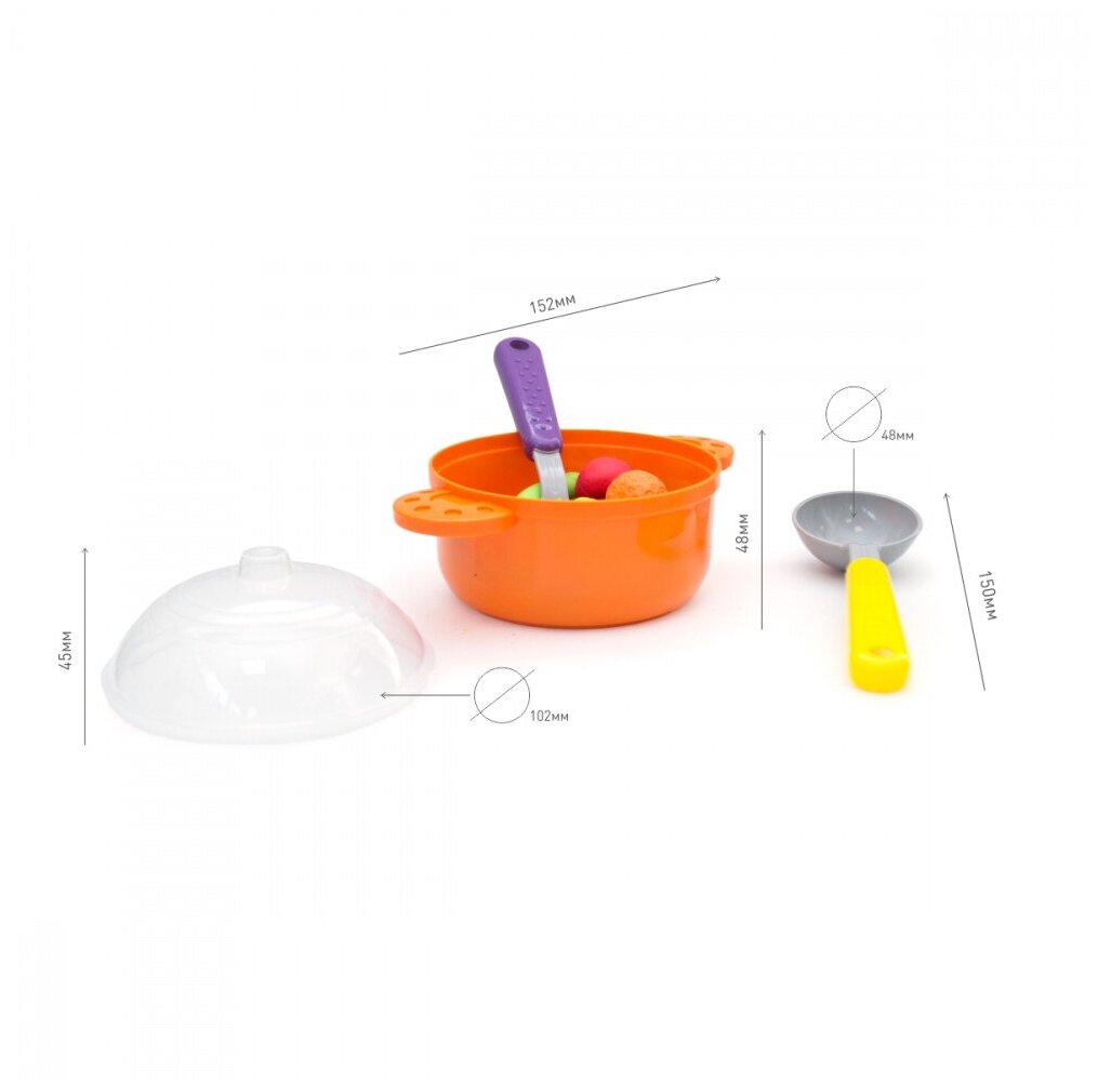 В его сотав входят: кастрюля, поварешка, шумовка, набор овощей и фруктов.