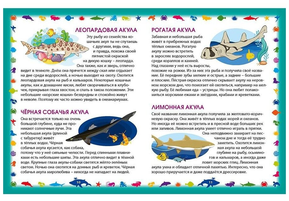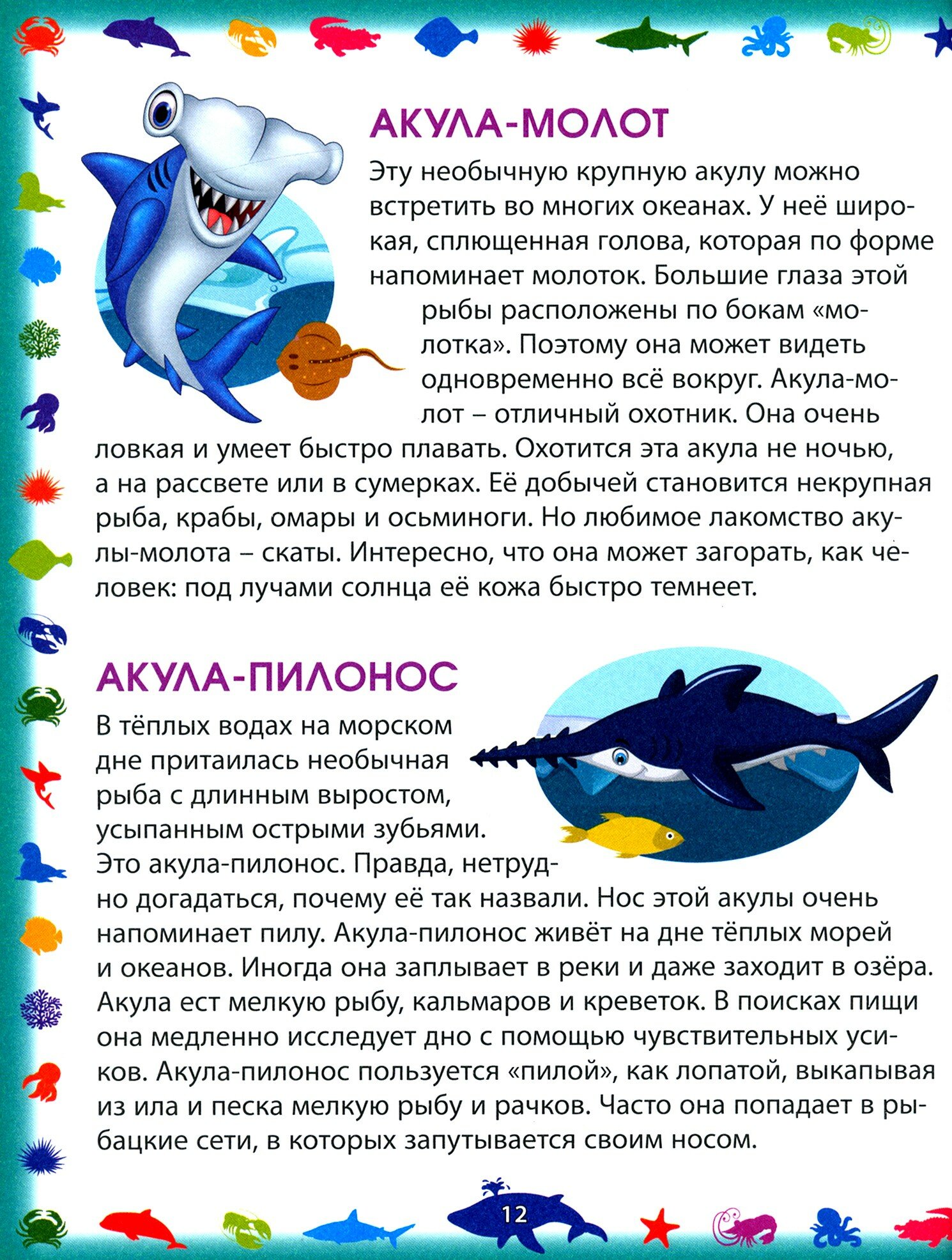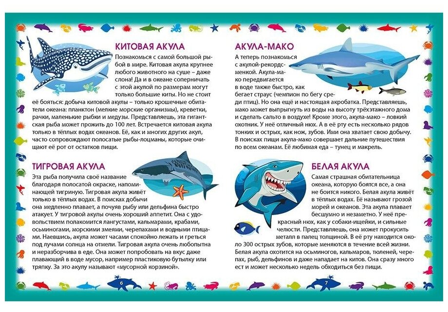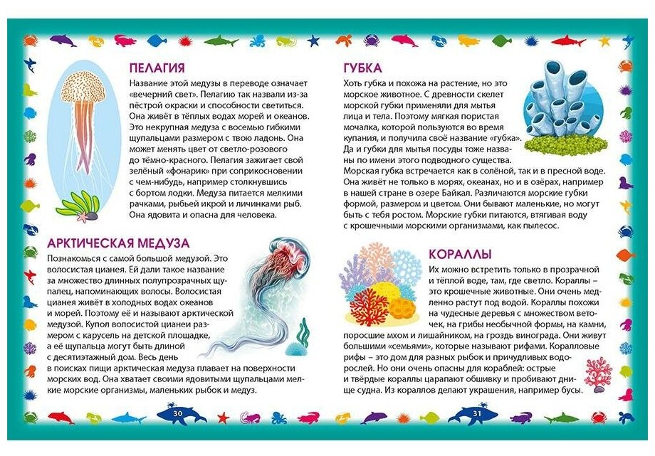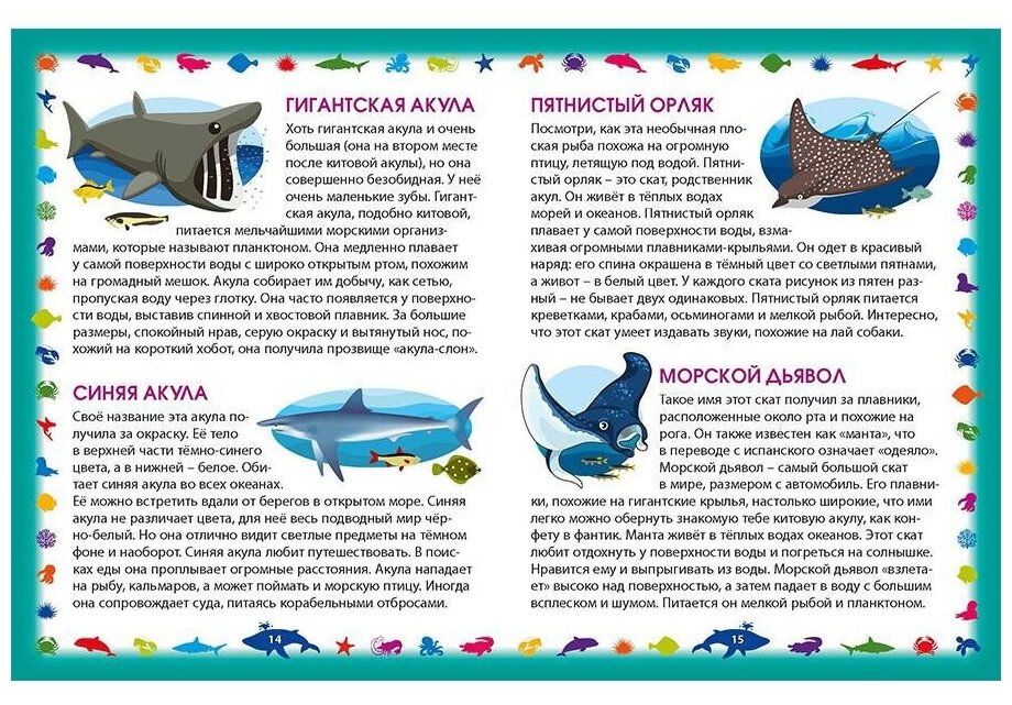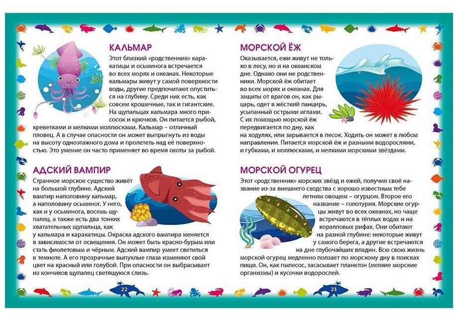 Рассматривая забавные и красочные иллюстрации, ваш ребёнок познакомится с самыми разными морскими обитателями: от огромного синего кита и быстрого финвала, самой большой китовой акулы и дружелюбных дельфинов до крохотной креветки, удивительной морской звезды и ярких рыбок. Простой и понятный текст этой первой энциклопедии поможет вам рассказать ему о том, где обитают эти необыкновенные животные, чем питаются и как общаются между собой.
