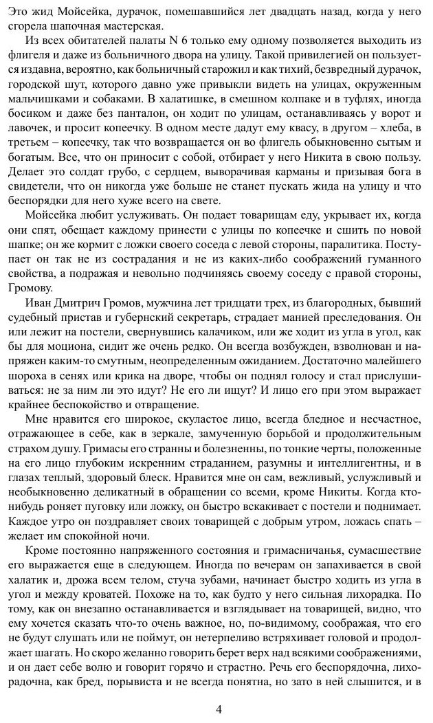 В больничном дворе стоит небольшой флигель, окруженный целым лесом репейника, крапивы и дикой конопли. Крыша на нем ржавая, труба наполовину обвалилась, ступеньки у крыльца сгнили и поросли травой, а от штукатурки остались одни только следы. Передним фасадом обращен он к больнице, задним глядит в поле, от которого отделяет его серый больничный забор с гвоздями. Эти гвозди, обращенные остриями кверху, и забор, и самый флигель имеют тот особый унылый, окаянный вид, какой у нас бывает только у больничных и тюремных построек...