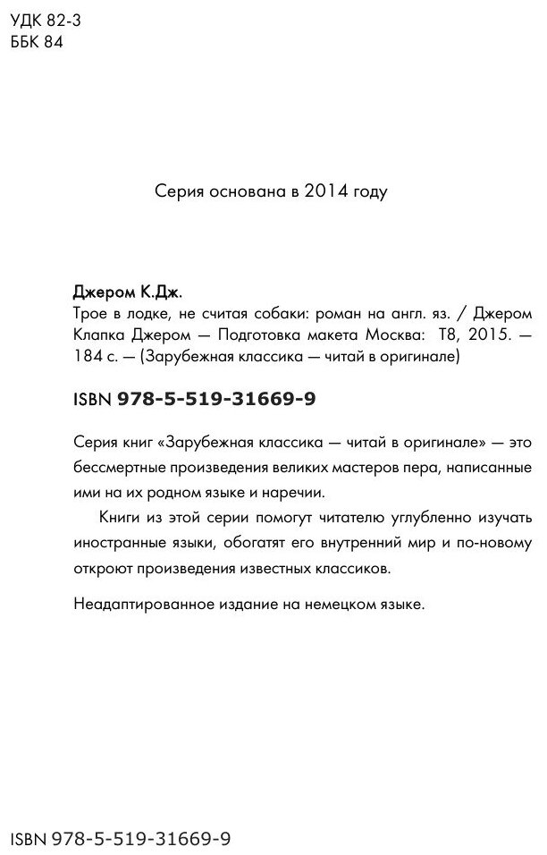 Роман Джерома Клапка Дж. «Трое в лодке, не считая собаки» вошел в серию книг «Зарубежная классика — читай в оригинале». Это бессмертные произведения великих мастеров пера, написанные ими на их родном языке и наречии.