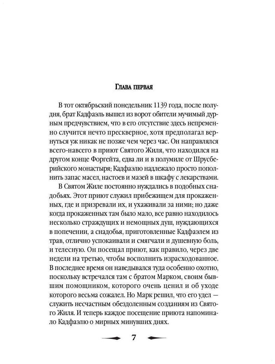 Однажды познакомившись с Кадфаэлем, который лечит людей и даже их души, расследует серьёзные преступления и часто наставляет на путь истинный, уже наверное просто невозможно забыть о нём. Он очень добр, справедлив, в чём-то забавен и иногда даже немножко смешон. Читаешь и чувствуешь какую-то удивительную благодать.