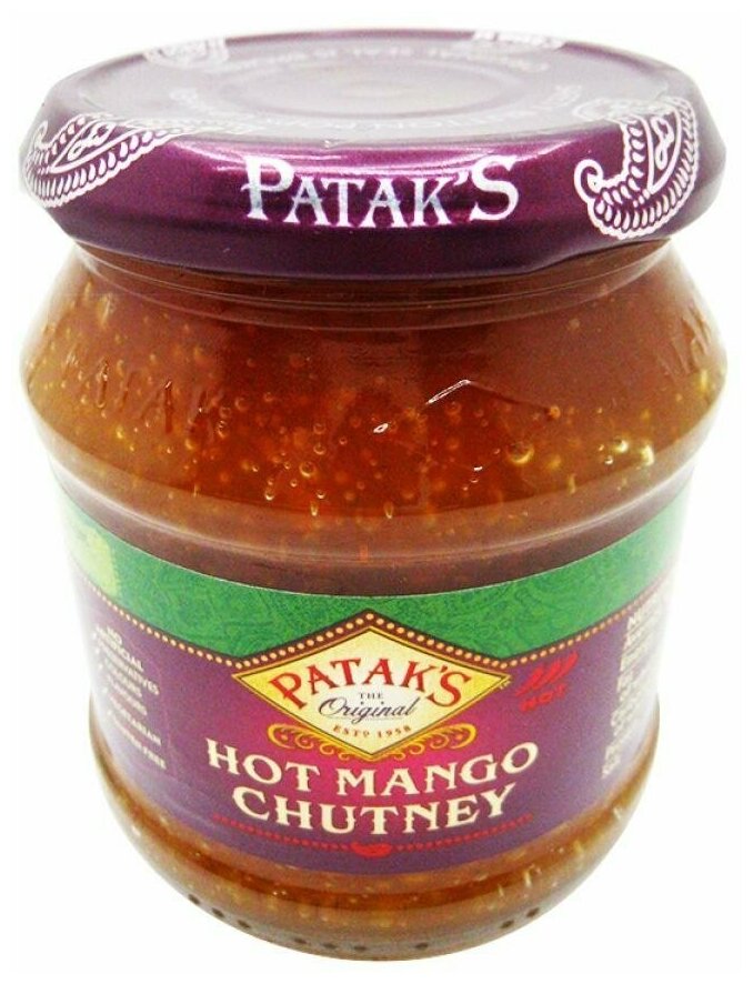 Hot Mango Chutney Patak`s Манго Чатни острая - острая и сладкая закуска с манго, или чатни, как ее называют в Индии, создана специально для приготовления овощных и мясных блюд, когда требуется привнести во вкус немного жгучести и аромата чеснока. В Индии известны более 3000 рецептов чатни, и в каждой семье его готовят по-своему! Специфическая смесь фруктов и пряностей влюбляет в себя с первой ложки: она умеренно острая, благодаря чему приятно согревает небо и язык, немного сладкая и очень ароматная! Чатни будет идеален в горячих бутербродах, карри, барбекю и шашлыках, в качестве основы для соуса к говядине или баранине. Входящие в состав соуса ингредиенты содержат много витаминов и минералов. А еще чатни рекомендуется включать в рацион, когда нужно повысить аппетит, нормализовать пищеварение, наладить работу желудочно-кишечного тракта. Способов использования чатни очень много — вы можете экспериментировать с ним в свое удовольствие! Способ употребления hot mango chutney Patak`s манго чатни острой С чатни готовят мясные и овощные блюда, колбаски, шашлыки, горячие бутерброды, цыпленка карри.Состав Сахар, манго, соль, уксус, специи, чеснок сушеный, красный перец.