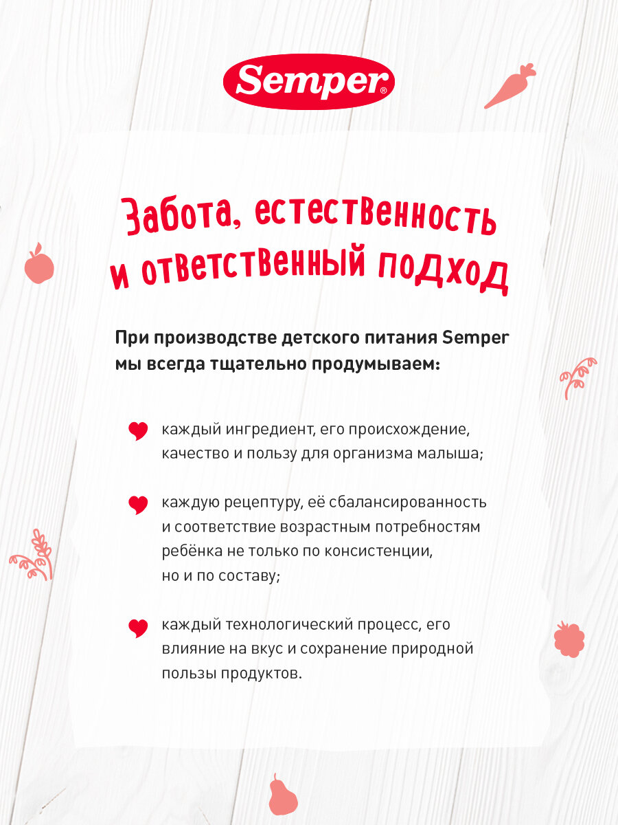 Semper - натуральное и премиальное детское питание №1 в Швеции. Мы придерживаемся шведских стандартов качества и философии экологичности, создавая вкусную еду для малышей.Представляем рыбное пюре Рагу овощное с тихоокеанским лососем (кетой) и рисом для детей с 9 месяцев. Мы вылавливаем кету в чистых водах северной части Тихого океана. Эта рыба обитает в естественной среде и питается натуральной пищей. Мы сохранили природную пользу кеты в нашем блюде.Кета отличается высоким содержанием полиненасыщенных жирных кислот (омега-3, омега-6) и витаминов группы B, которые способствуют умственному развитию малыша.Пюре содержит кусочки риса и овощей (морковки, сельдерея) для развития навыков жевания, 100 % натуральное:без крахмалабез ароматизаторов, консервантов, искусственных красителейбез ГМОПопробуйте также другие пюре с кусочками Семпер из красной и белой рыбы (форель, семга, треска), вегетарианские и мясные готовые обеды в баночках.