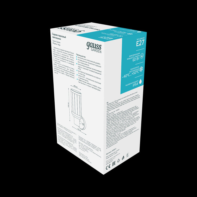 Уличный настенный светильник Gauss Vega 10.5*24*14.2cm 170-240V / 50Hz 1xE27 Max.60W IP: 54 1/24