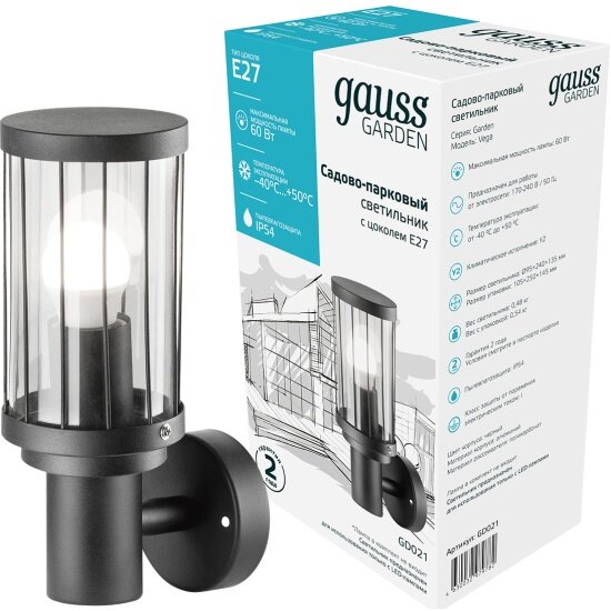 Cадово-парковый светильник Gauss идеально впишется в большинство современных и классических зданий и загородных домов. Светильник предназначен для общего и декоративного освещения фасадов зданий, загородных домов, террас, ресторанов, кафе.Преимущества Gauss:Настенный садово-парковый светильник имеет современный стильный дизайн.Не подвержен коррозии.Влагонепроницаемый алюминиевый корпус с высокой пыле и влагозащитой IP54.Долговечный рассеиватель из закаленного стекла.Эффективная работа в любой сезон при высоких и низких температурах.