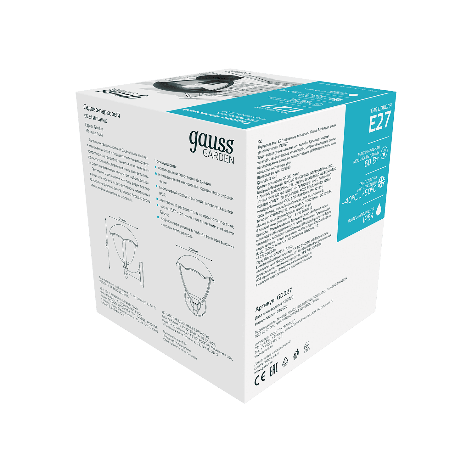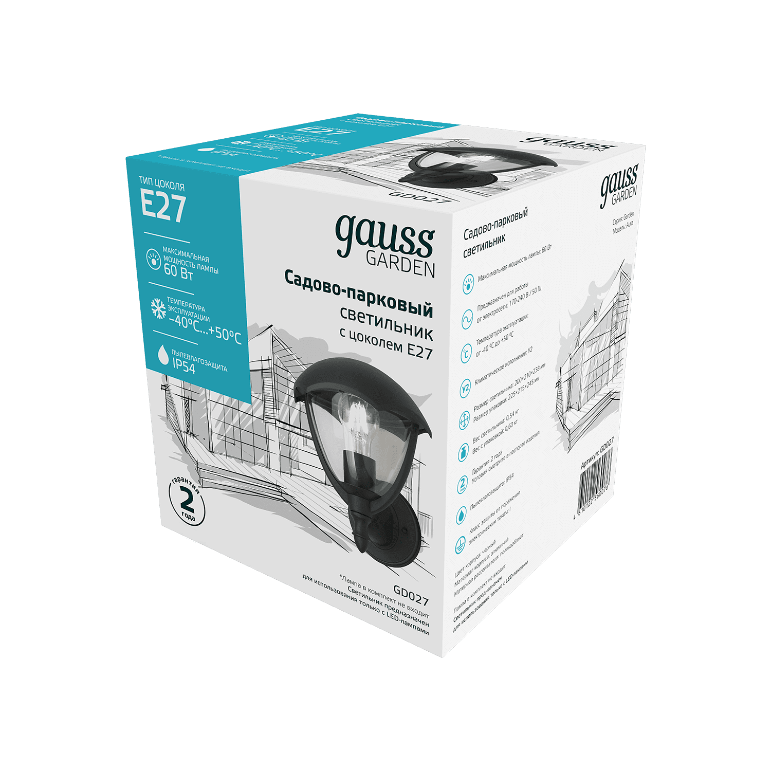 Садово-парковые светильники Gauss серии Aura с установкой на стену вниз прекрасно дополнят дизайн вашего пространства, а также создадут уютную атмосферу. Помимо декоративной составляющей в придании эстетичности и завершенности архитектурной композиции участка, светильники серии Aura помогают ориентироваться в пространстве в ночное время суток, выполняя задачу общего освещения. Высокая пыле и влагонепроницаемость IP54, а также рассеиватель из прочного пластика позволит использовать светильник на открытых пространствах. Такие светильники Sonata способны работать в любой сезон при высоких и низких температурах в диапазоне от -40°C до +50°C. Обеспечьте не только безопасное передвижение по участку в темное время суток, но и неповторимый образ вашего сада, за счет игры света и теней, с помощью садово-парковых светильников Gauss серии Aura.