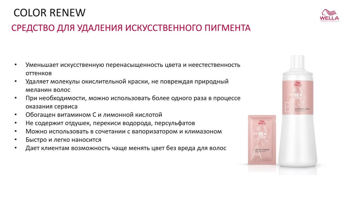 Способ применения: пропорция смешивания 1:10. Смешайте содержимое одного пакетика (саше) кристалл-пудры Color Renew с лосьоном-активатором в мисочке или аппликаторе. Нанесите на волосы от корней до кончиков. Время выдержки 5–45 минут в зависимости от выбранной услуги и желаемой степени коррекции тона. При подготовке к новому окрашиванию используйте для смывания средства только воду.