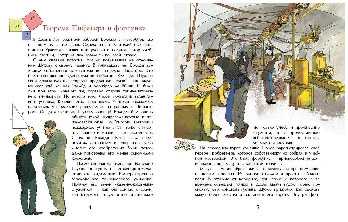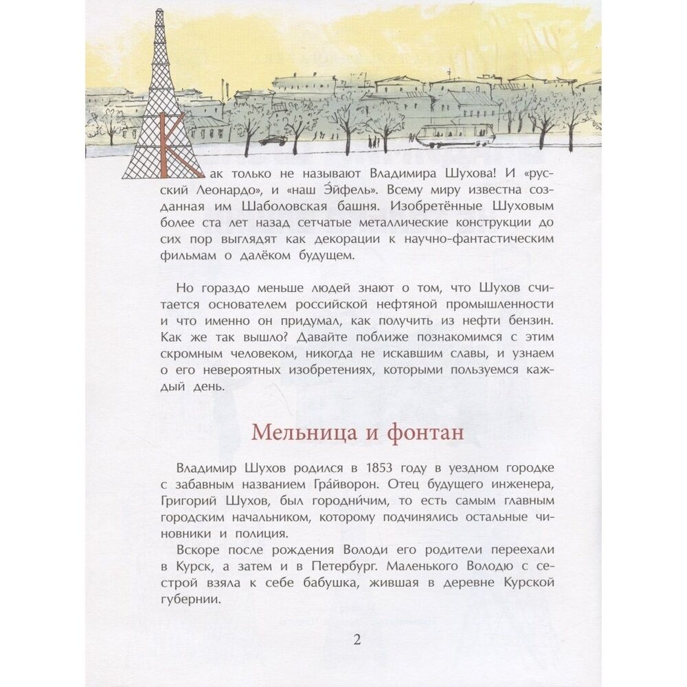Книга - просто находка для взрослых, стремящихся привить ребёнку интерес к познавательной информации. Прочитав её, можно узнать, что такое гиперболоид инженера Шухова. Знаменитая Шуховская башня на Шаболовке признана мировым архитектурным шедевром. Под руководством Шухова построено более 400 мостов. Именно он придумал стеклянные прозрачные крыши, изобрёл знаменитый паровой водотрубный котёл, является основателем российской нефтяной промышленности. Книга расскажет, почему ему должны быть благодарны автомобилисты всего мира. Изобретениями Шухова мы пользуемся каждый день. Автор сложных инженерных сооружений успевал заниматься спортом, фотографировать. А ещё он был не только работоспособным, но и скромным. В общем, для юного читателя это достойный пример для подражания.