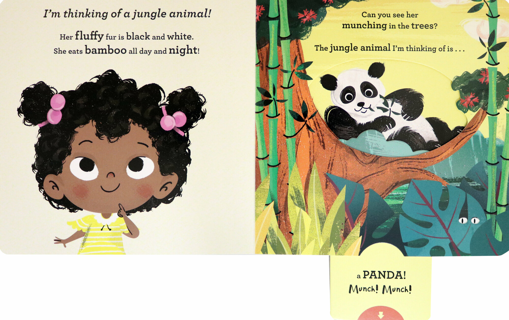 Each child is thinking of jungle animal . . . What do they look like? What do they eat? And what noise do they make? Follow the simple clues, make a guess, then spot the animal hiding in the beautifully illustrated scene and pull the slider to reveal the answer! With four favourite jungle animals to find – and animal noises too!